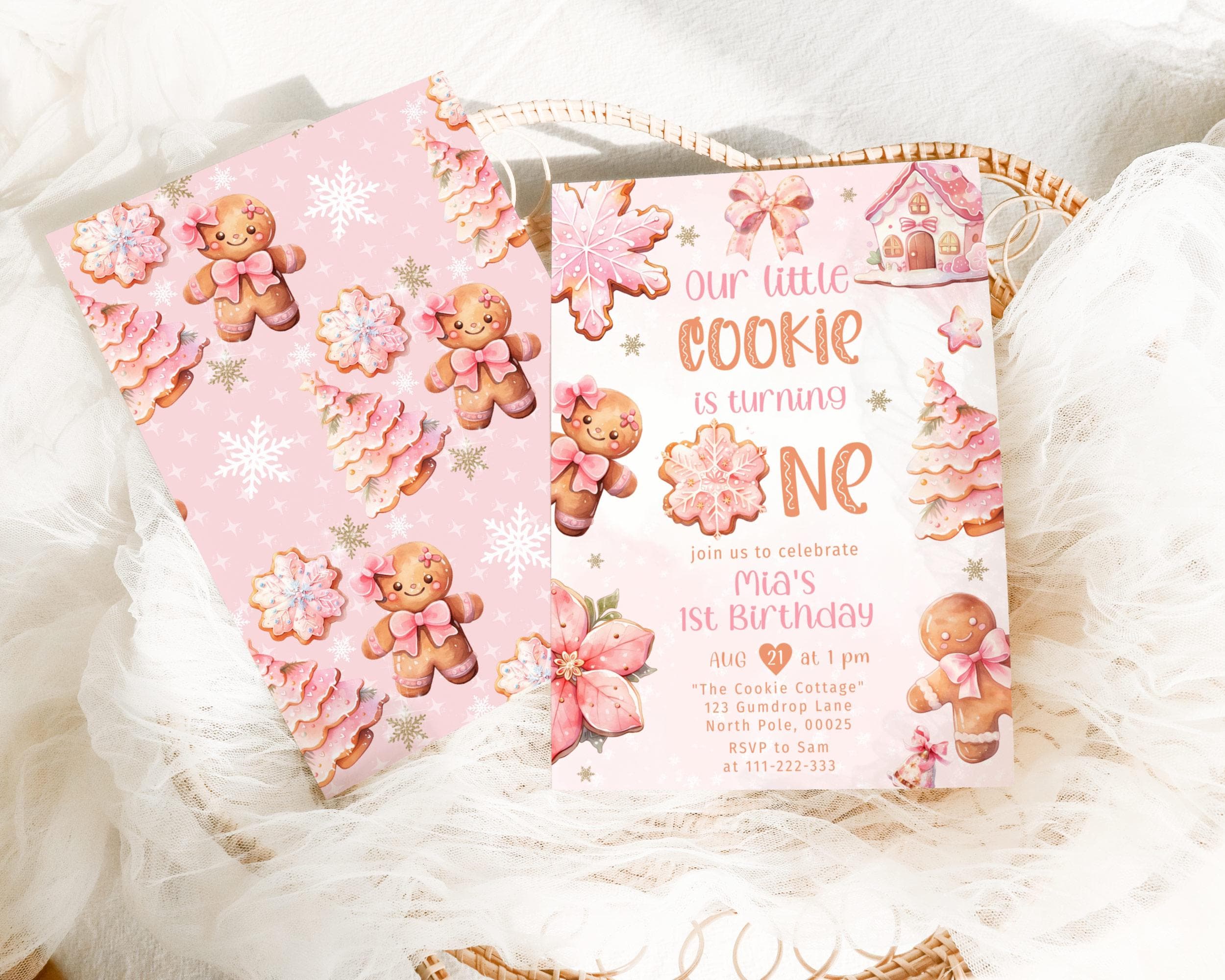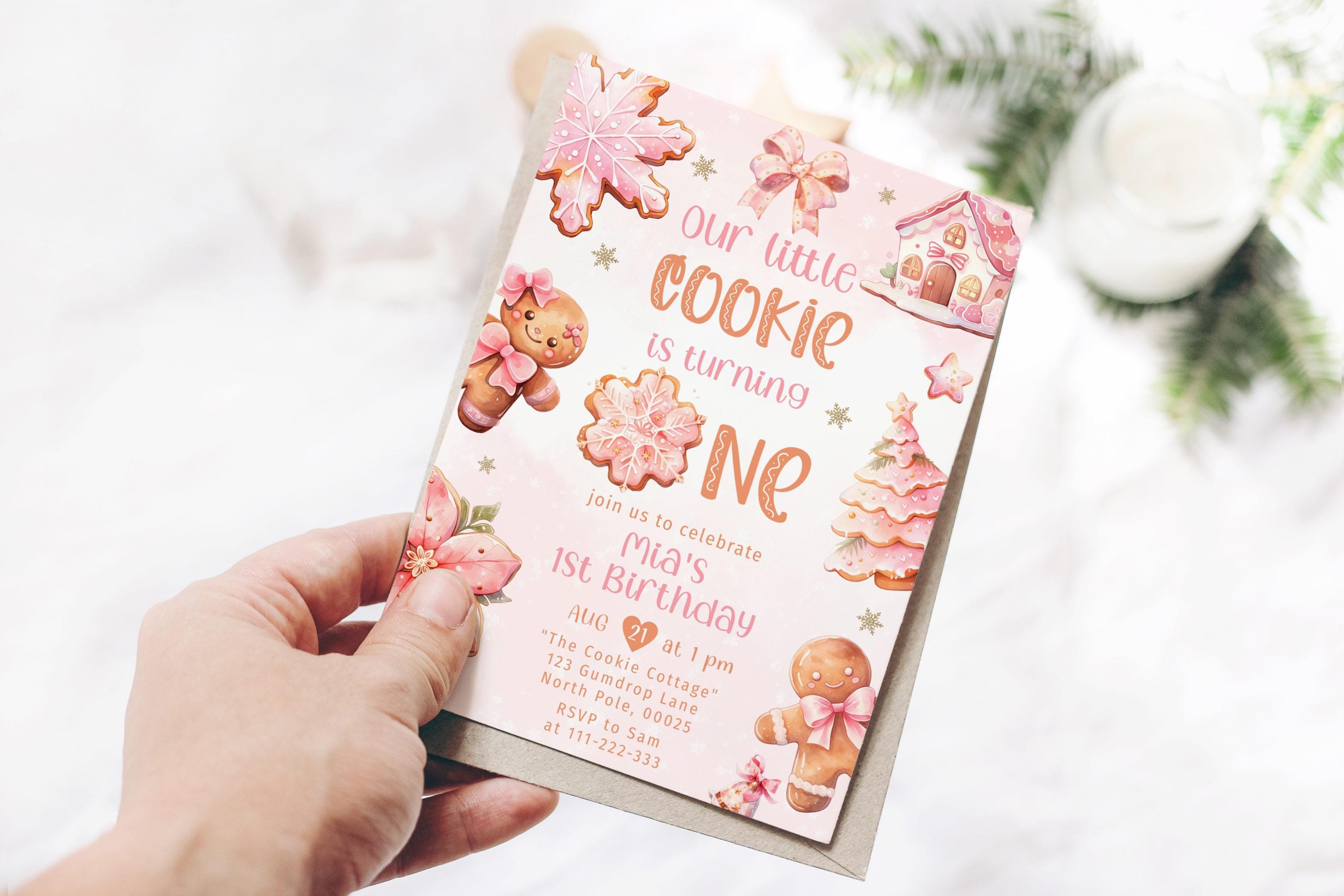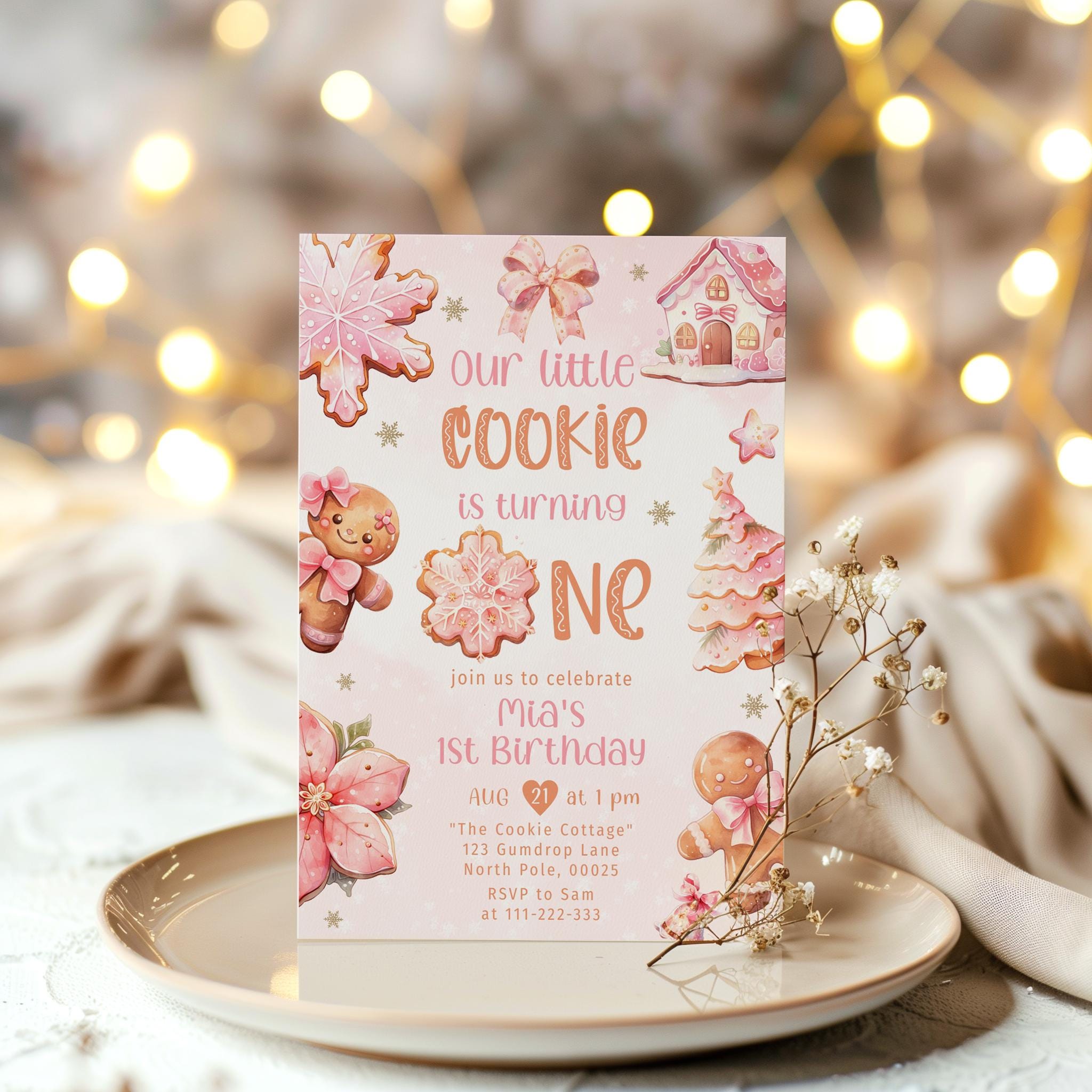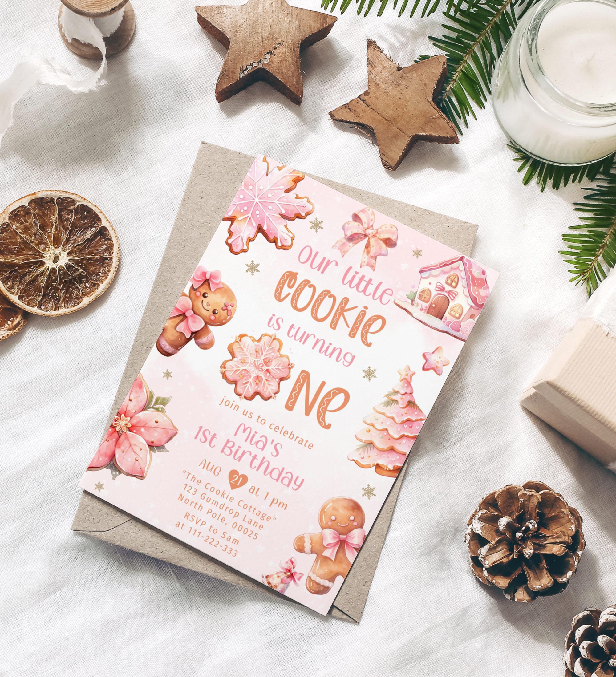 Editable One little Cookie Christmas Girl 1st Birthday invitation. Pink Gingerbread Little Cookie is Turning One invite