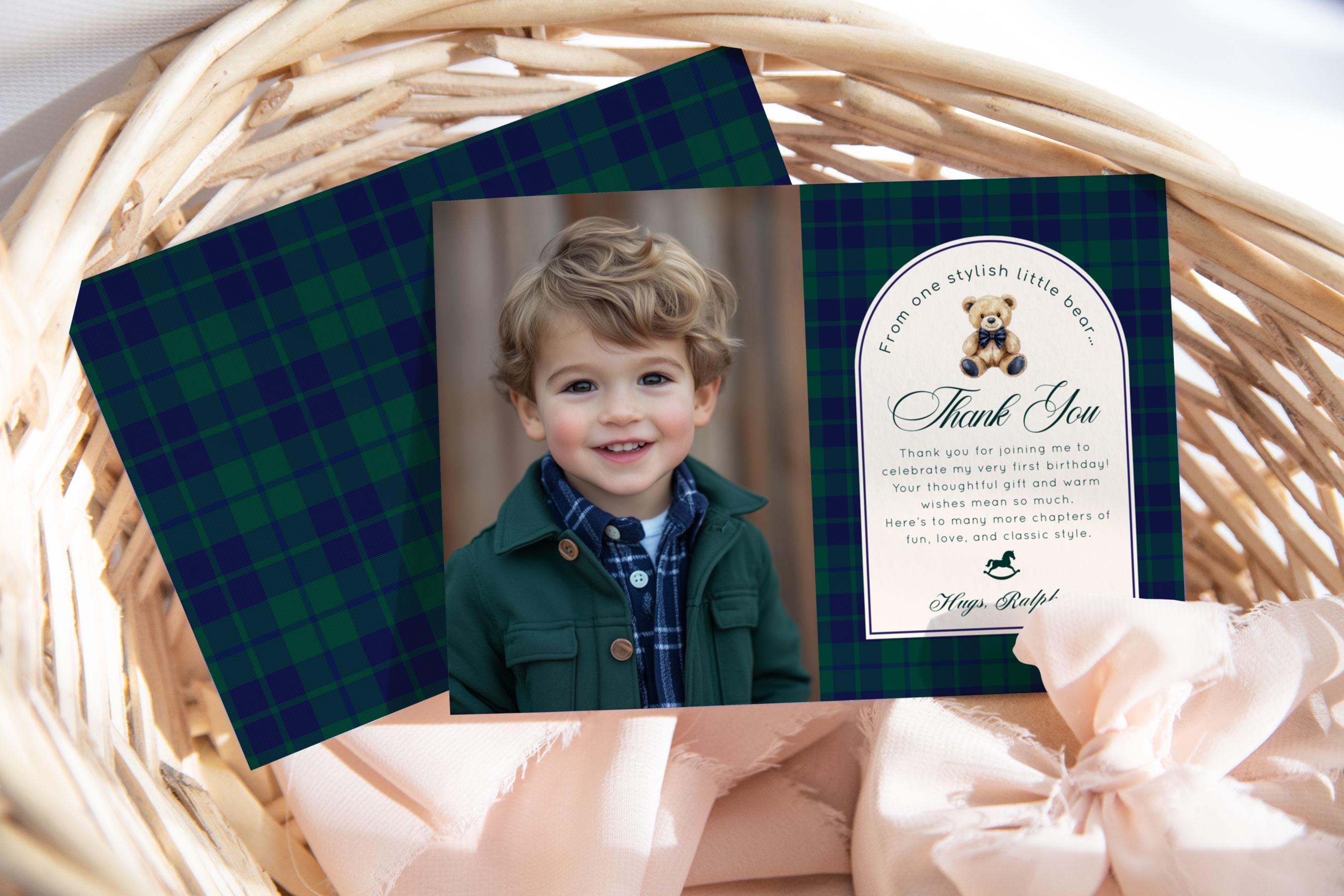 Polo Teddy Bear Beary 1st Birthday Photo Thank you Card template Corjl