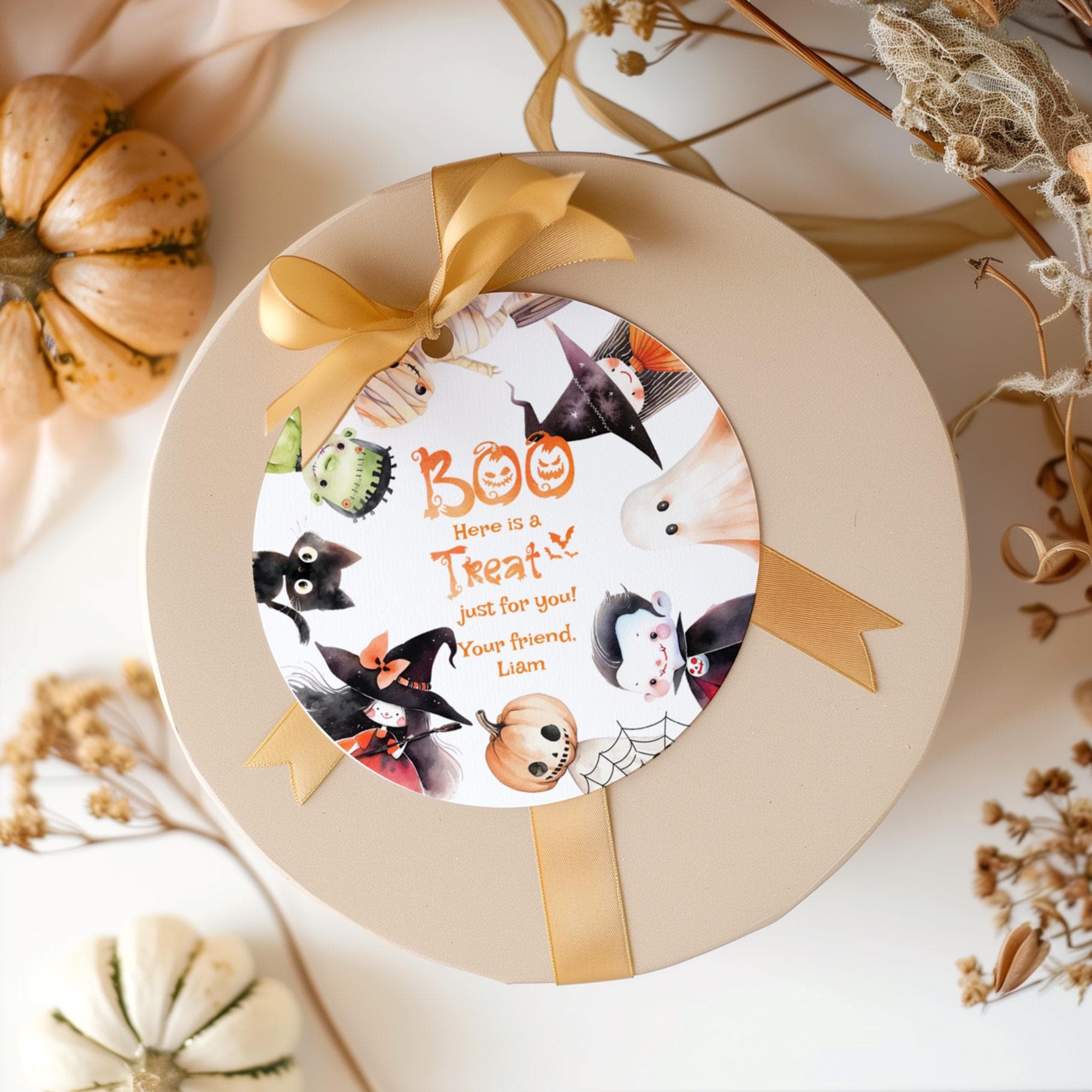 Boo Here is a treat just for you Halloween party round sticker tag template. Corjl Editable Download