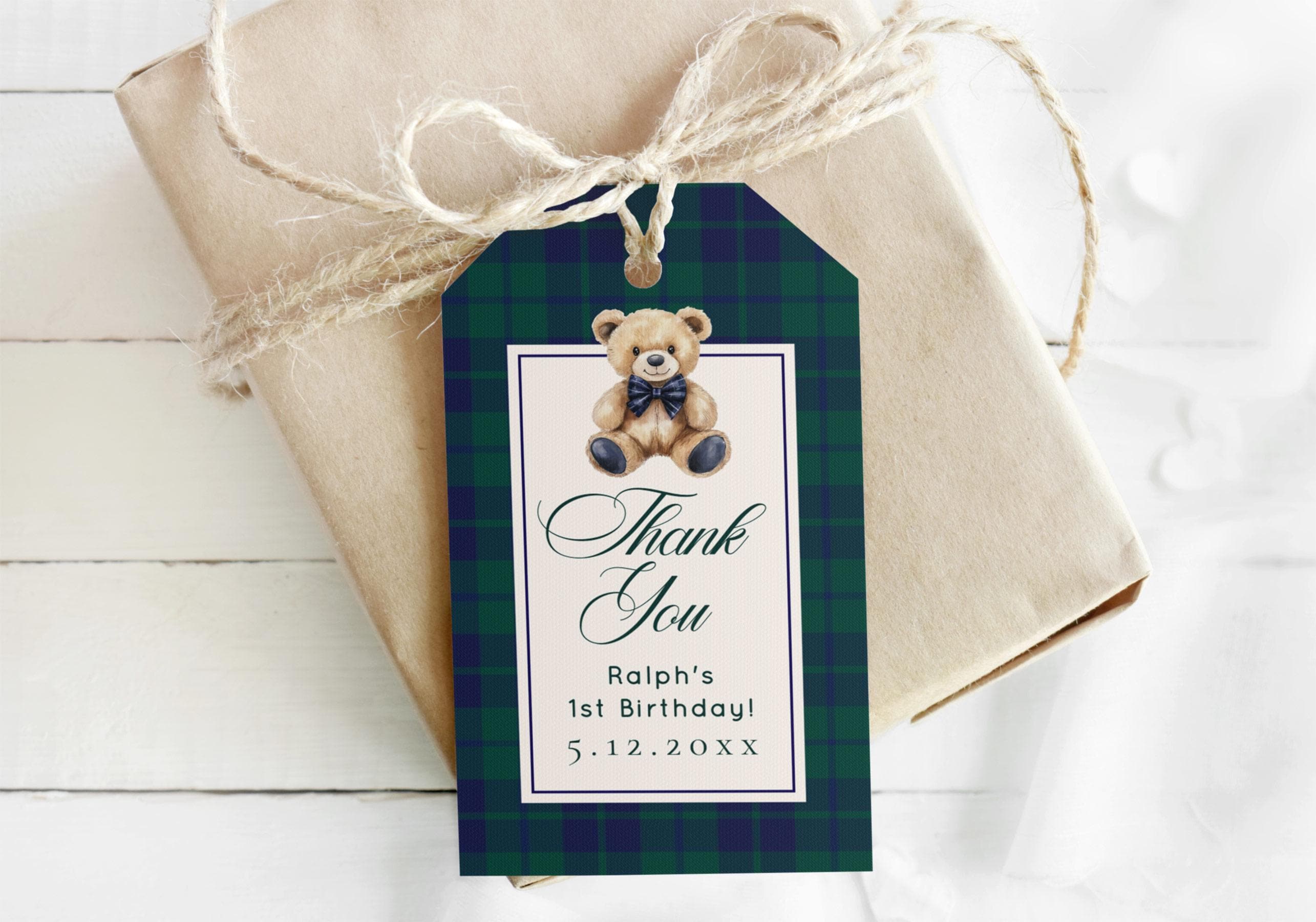 Polo Teddy Bear Beary 1st Birthday Favor tag template. Editable Navy plaid thank you Corjl