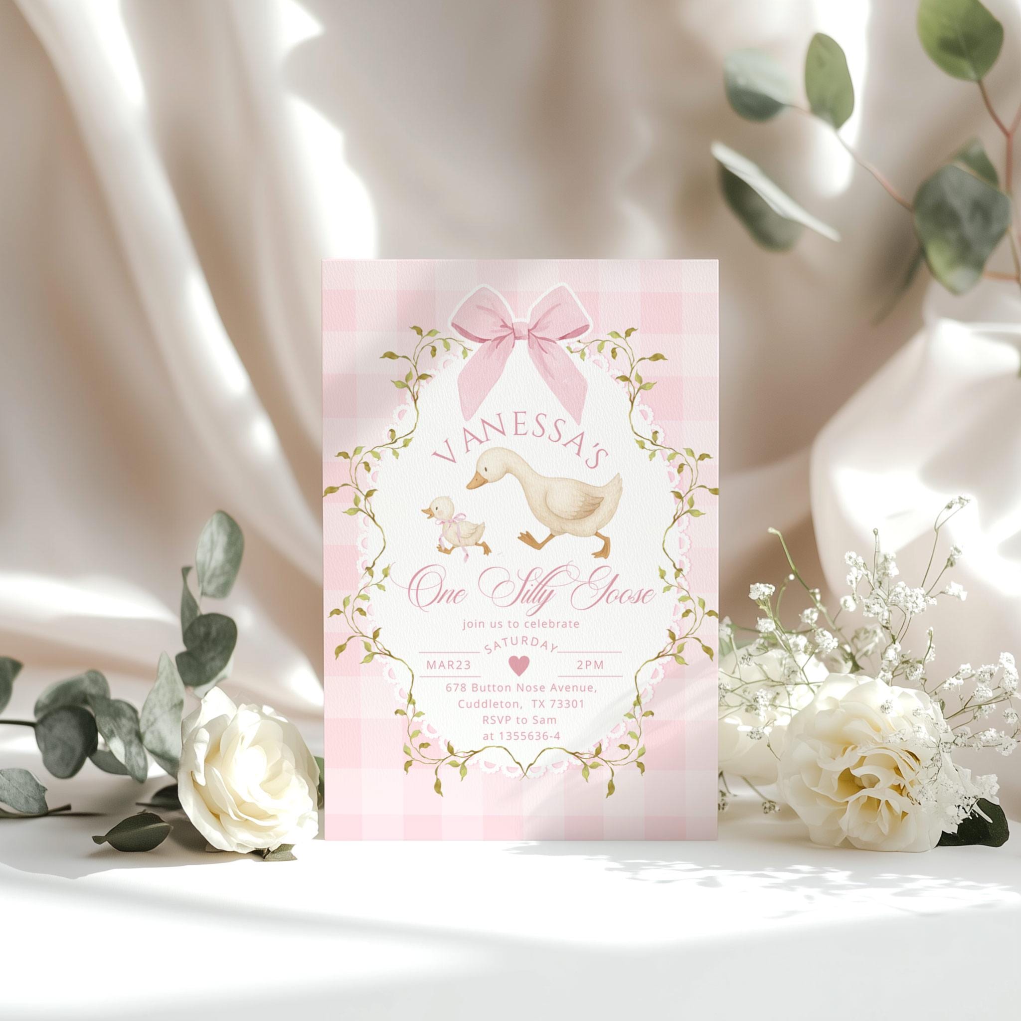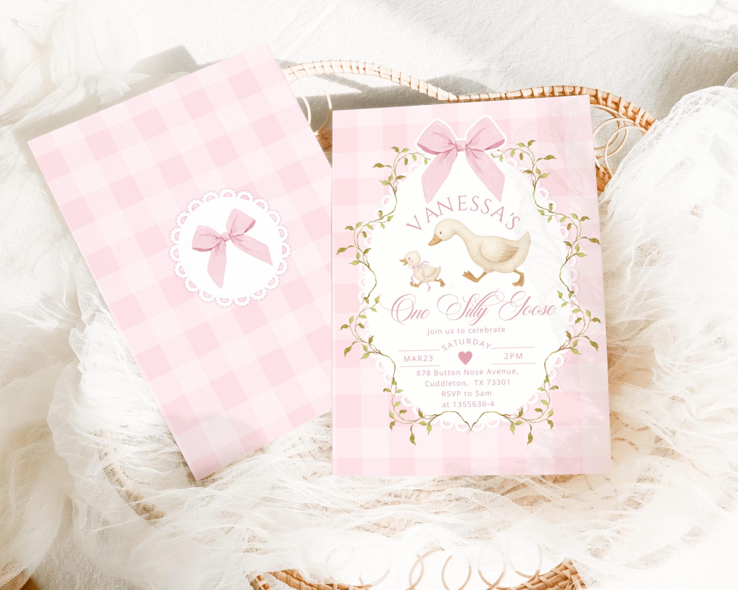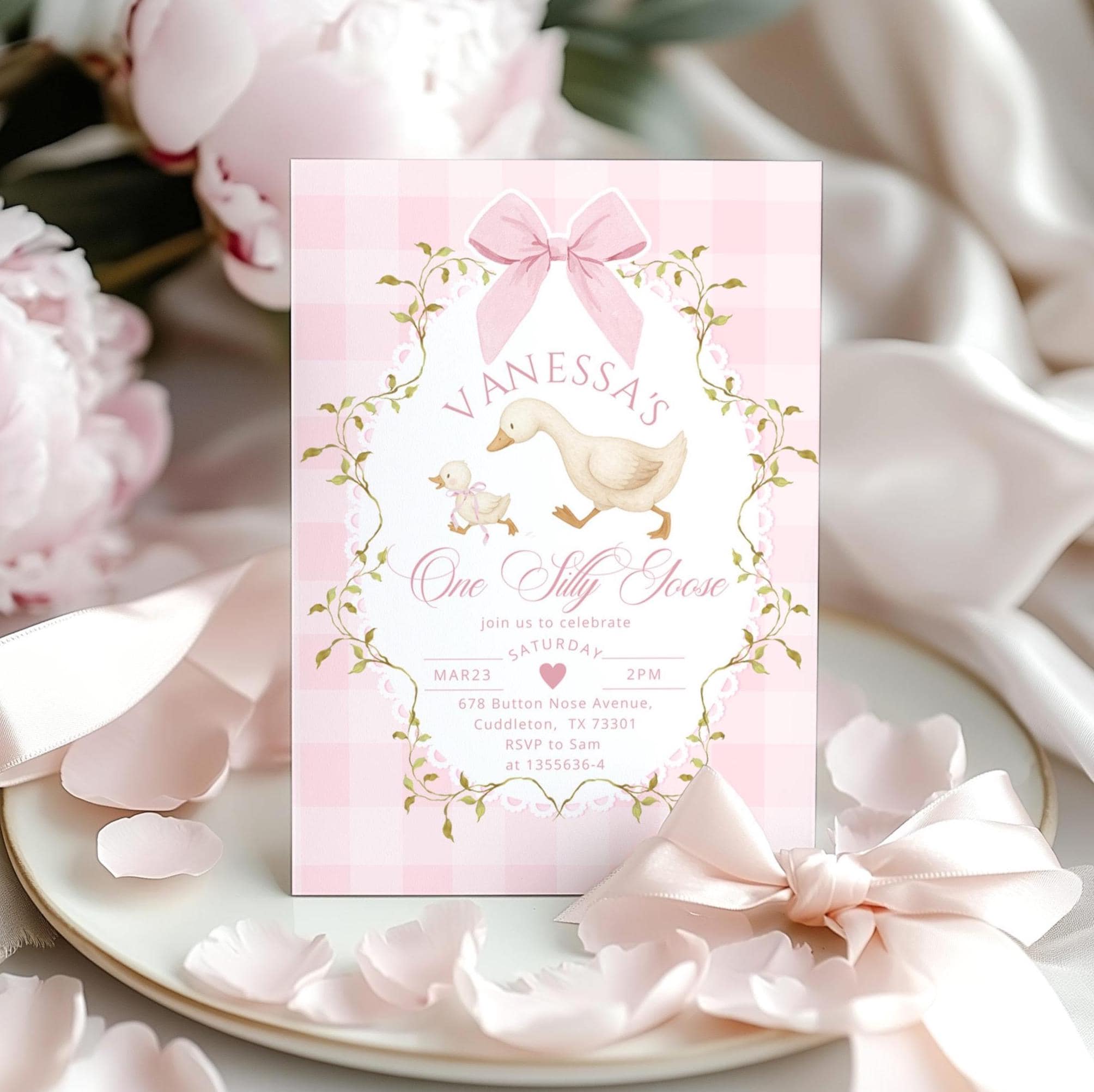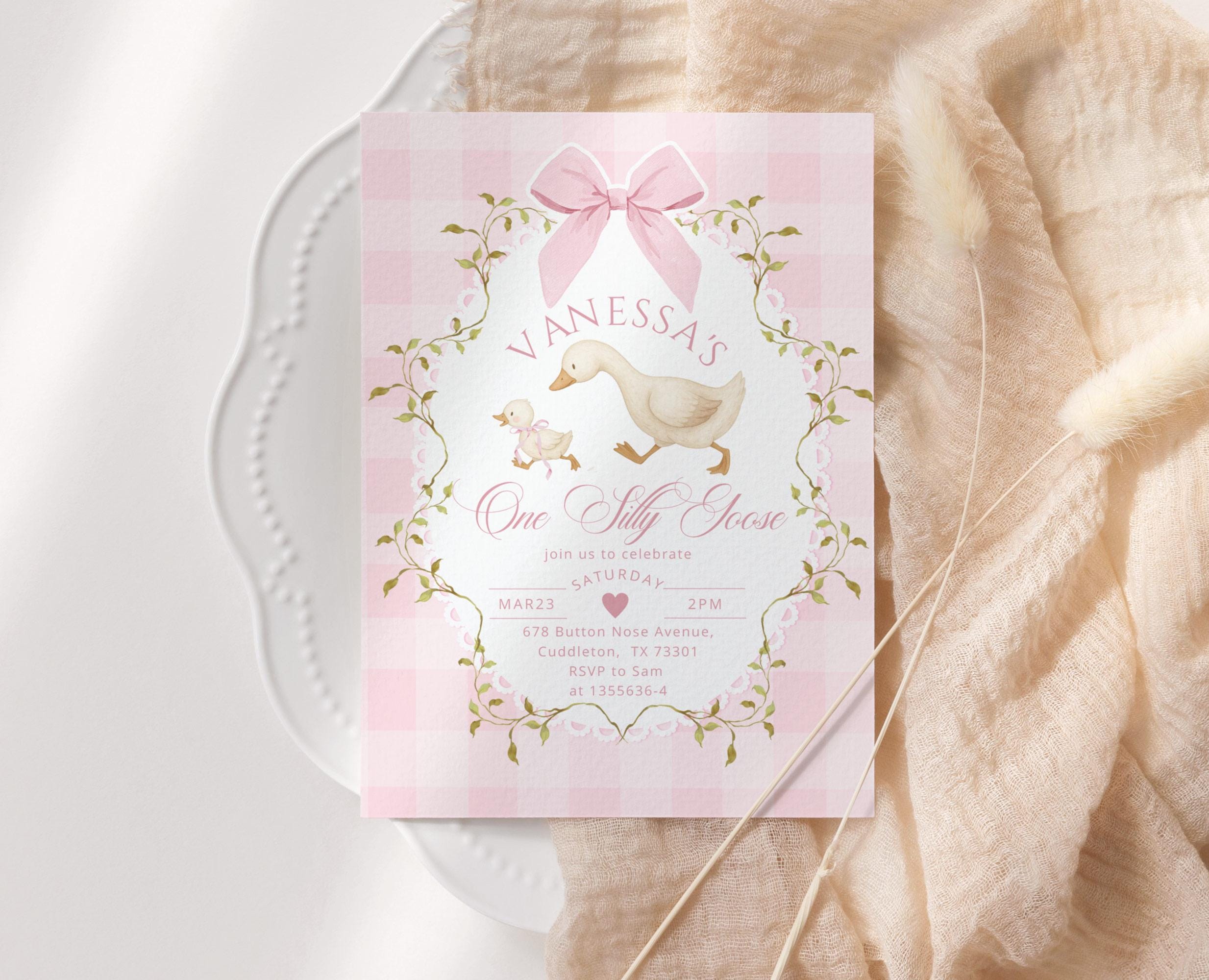 Editable One Silly Goose Pink girl First Birthday invitation, Girl Gingham invite Corjl template