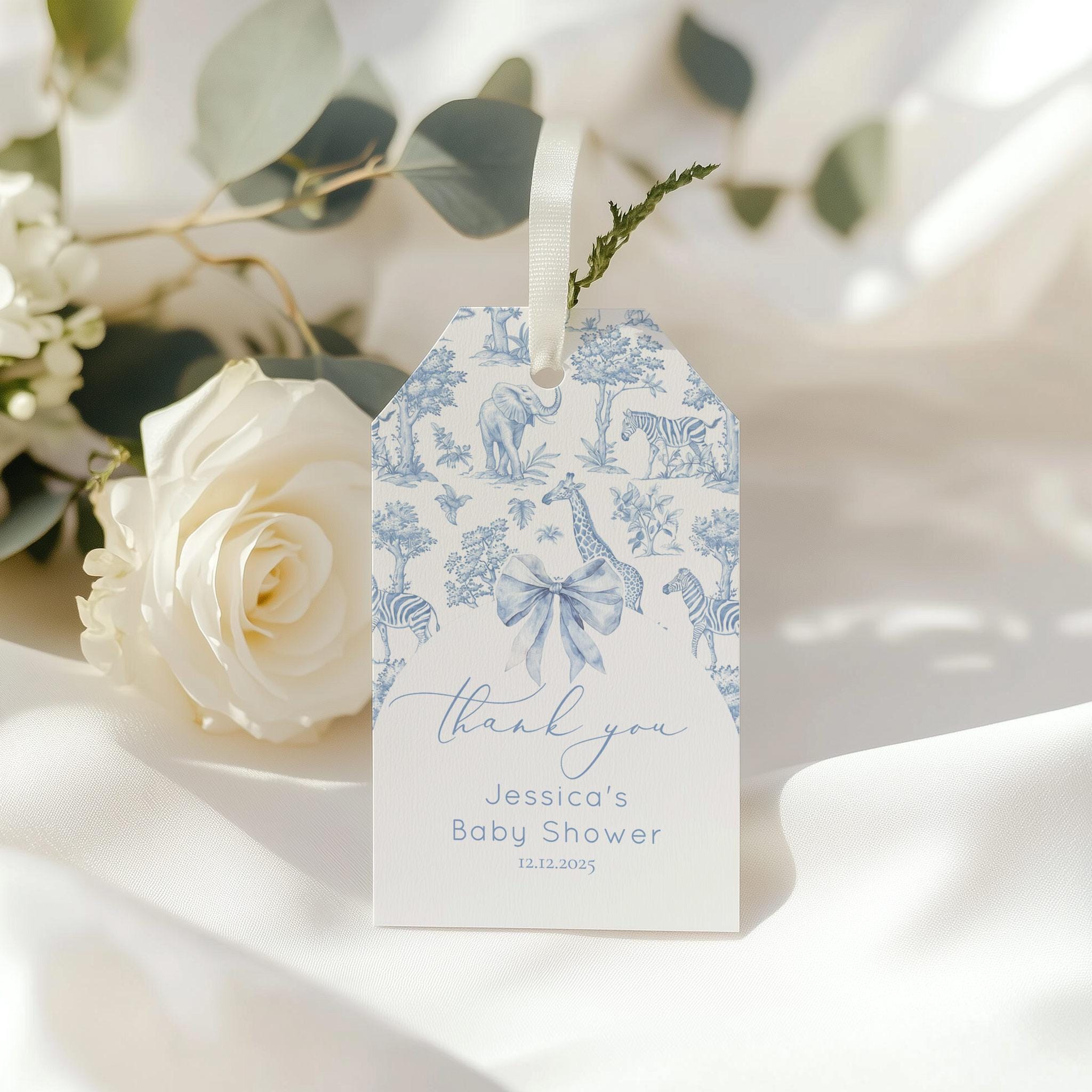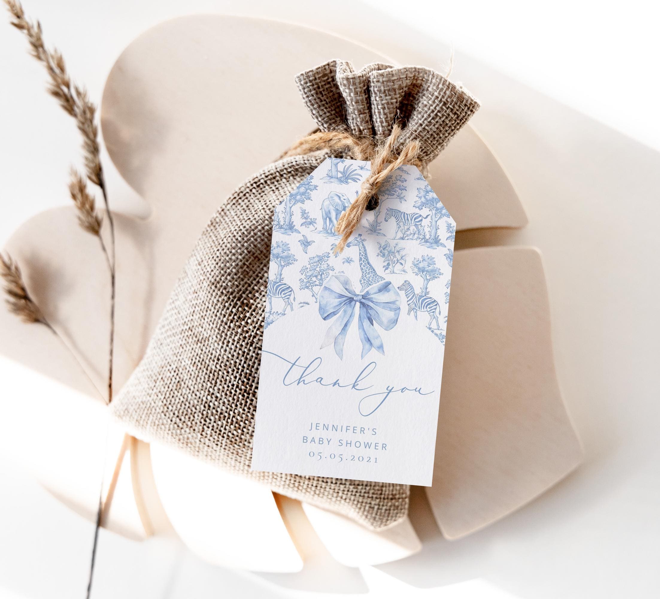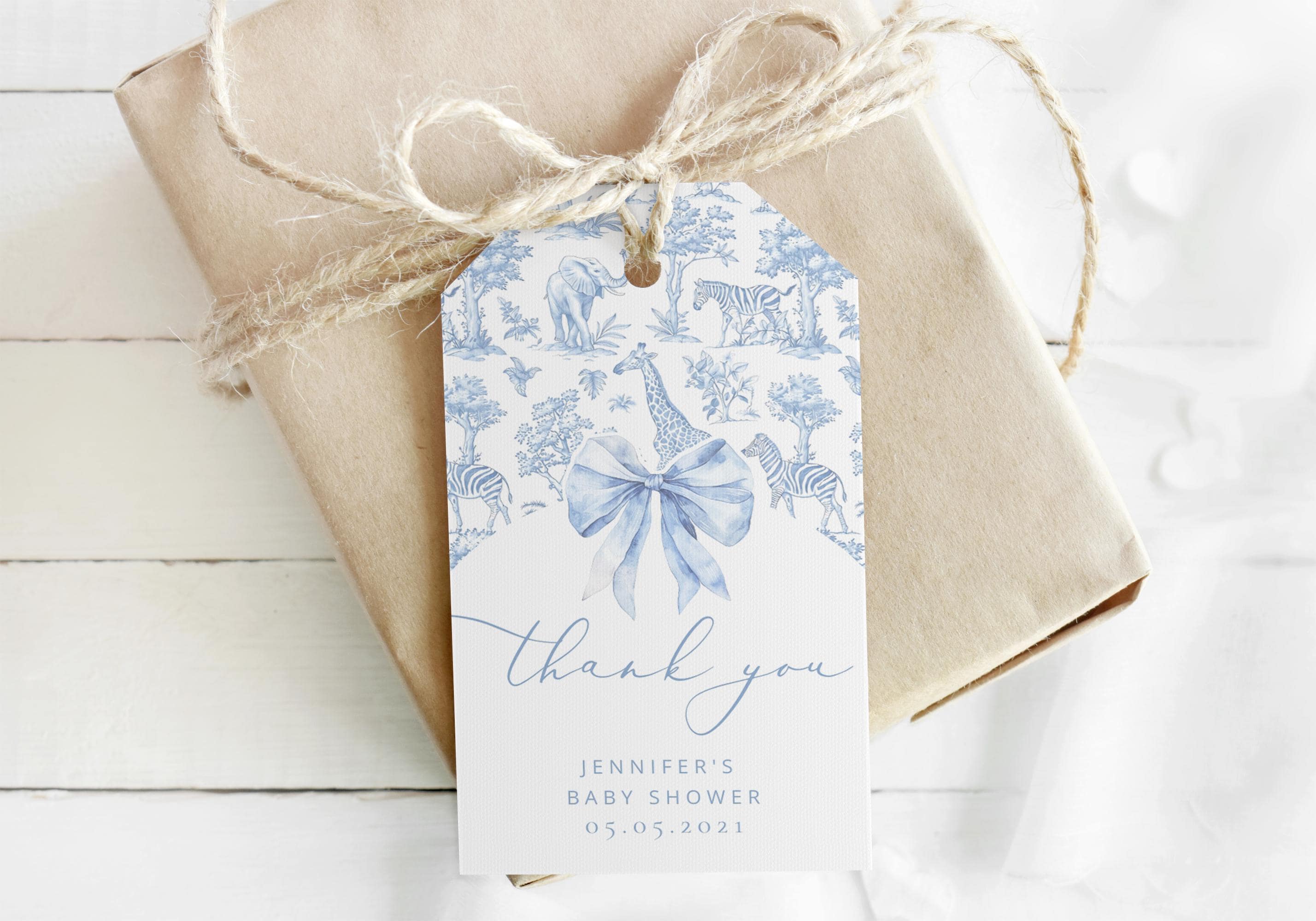 Toile de Jouy Blue Safari animals thank you Favor tag template. Editable Corjl Download