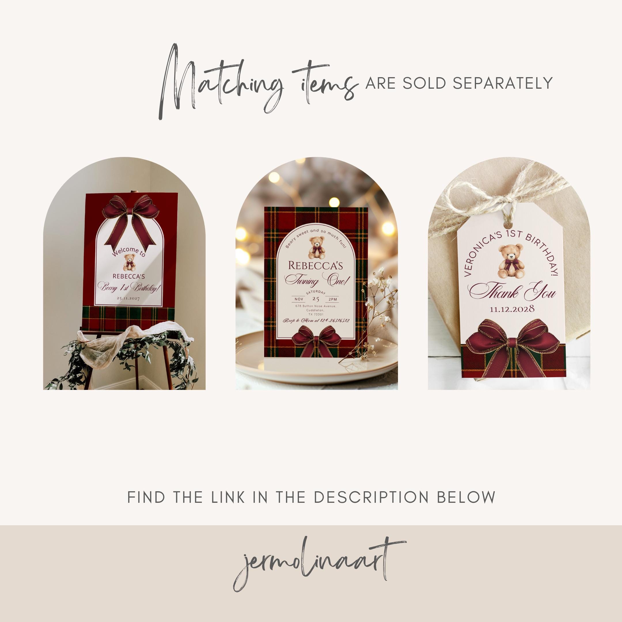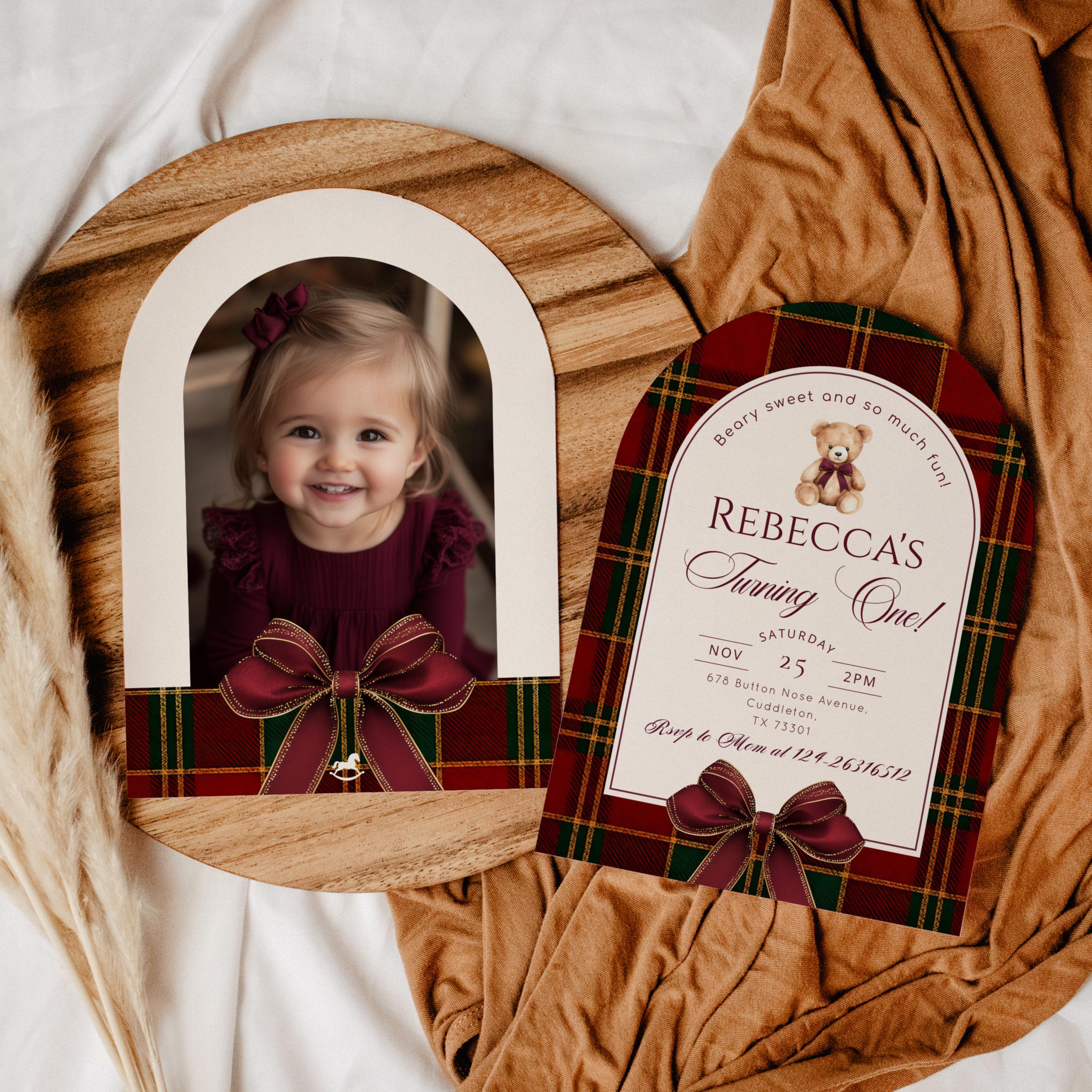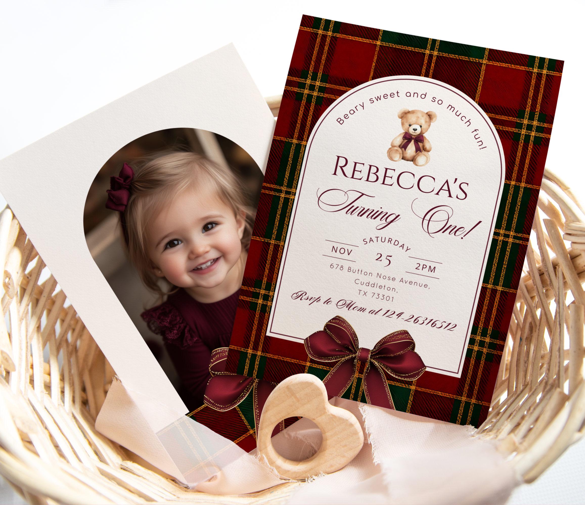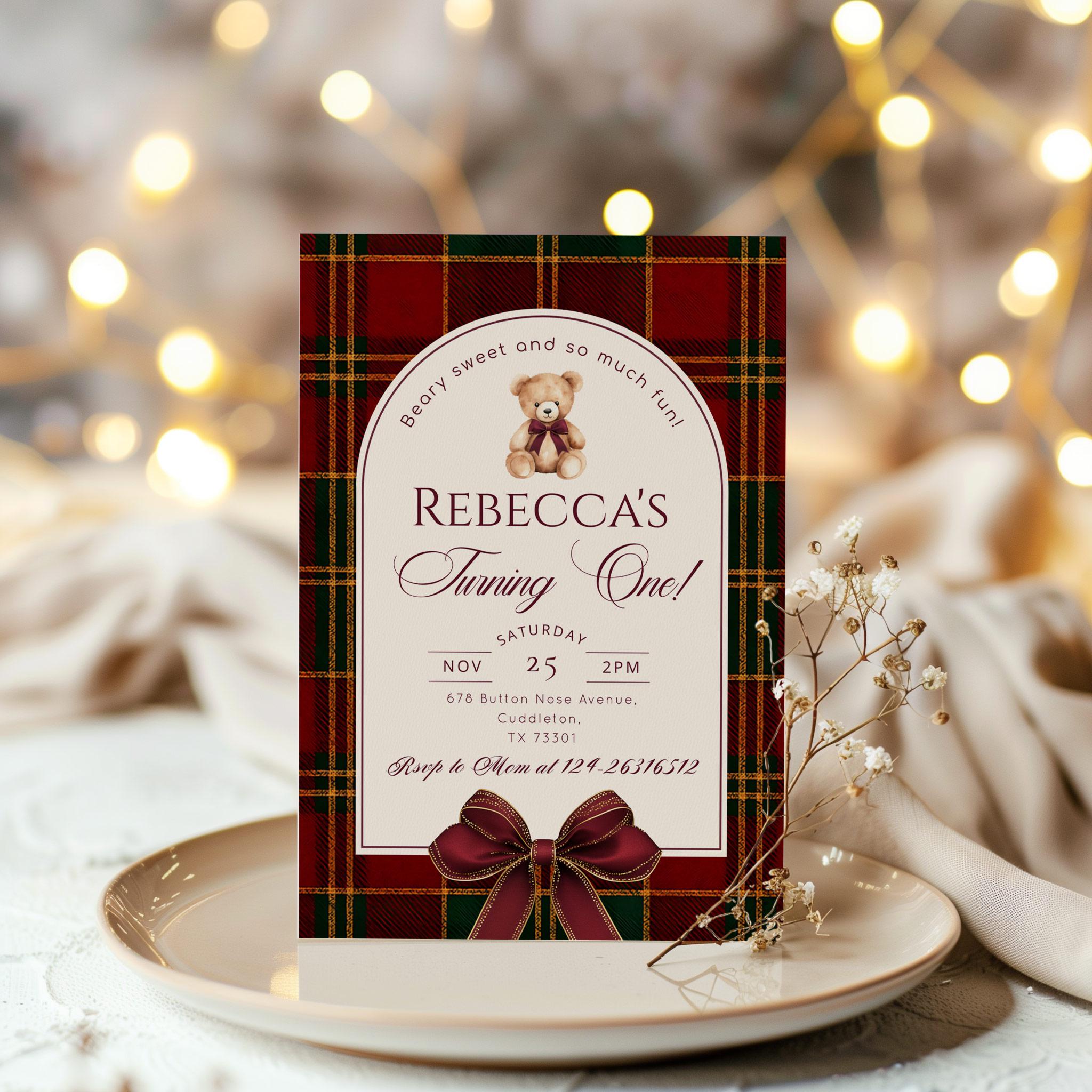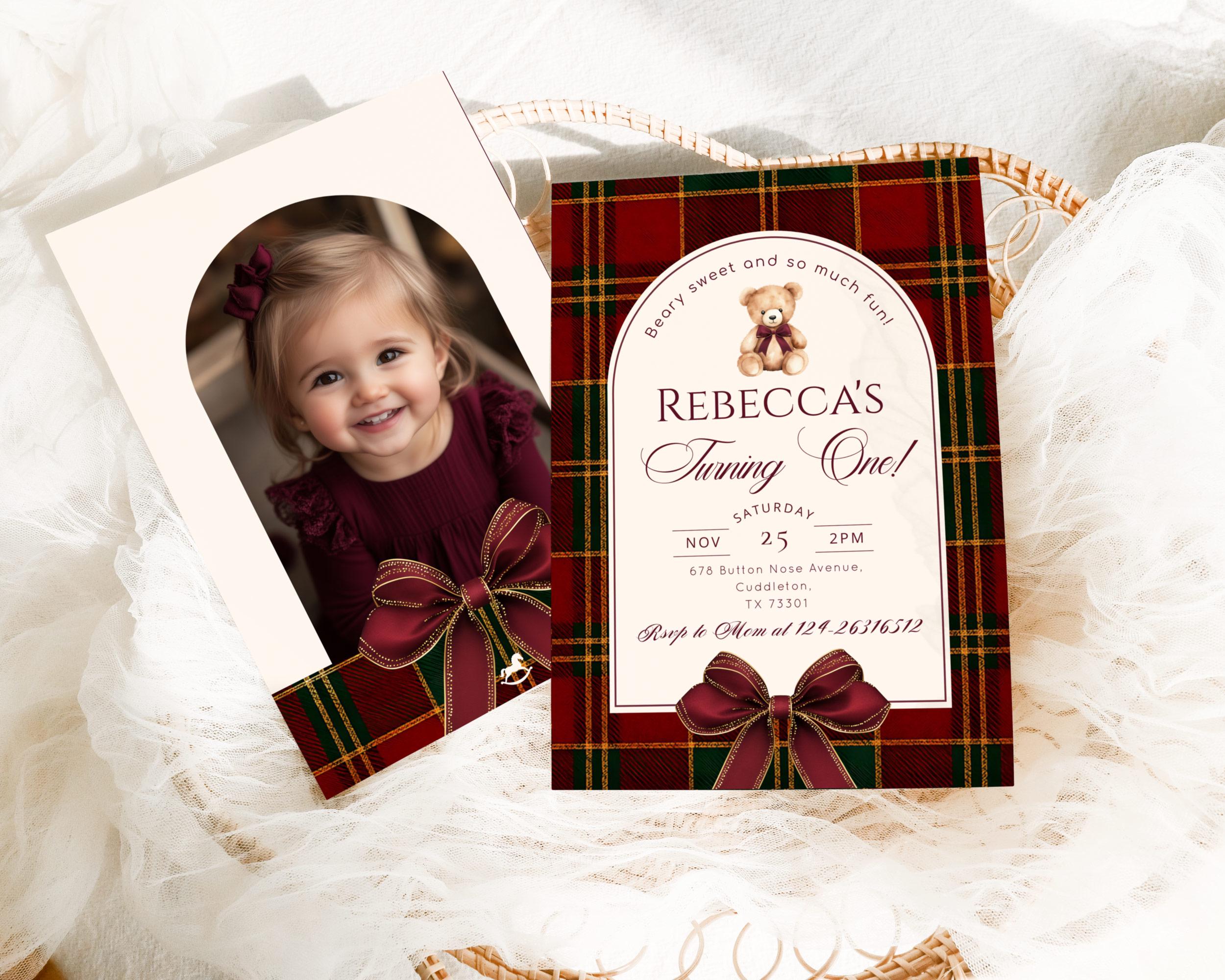 Winter Bear Birthday invitation, Christmas Plaid Winter Editable Corjl Template