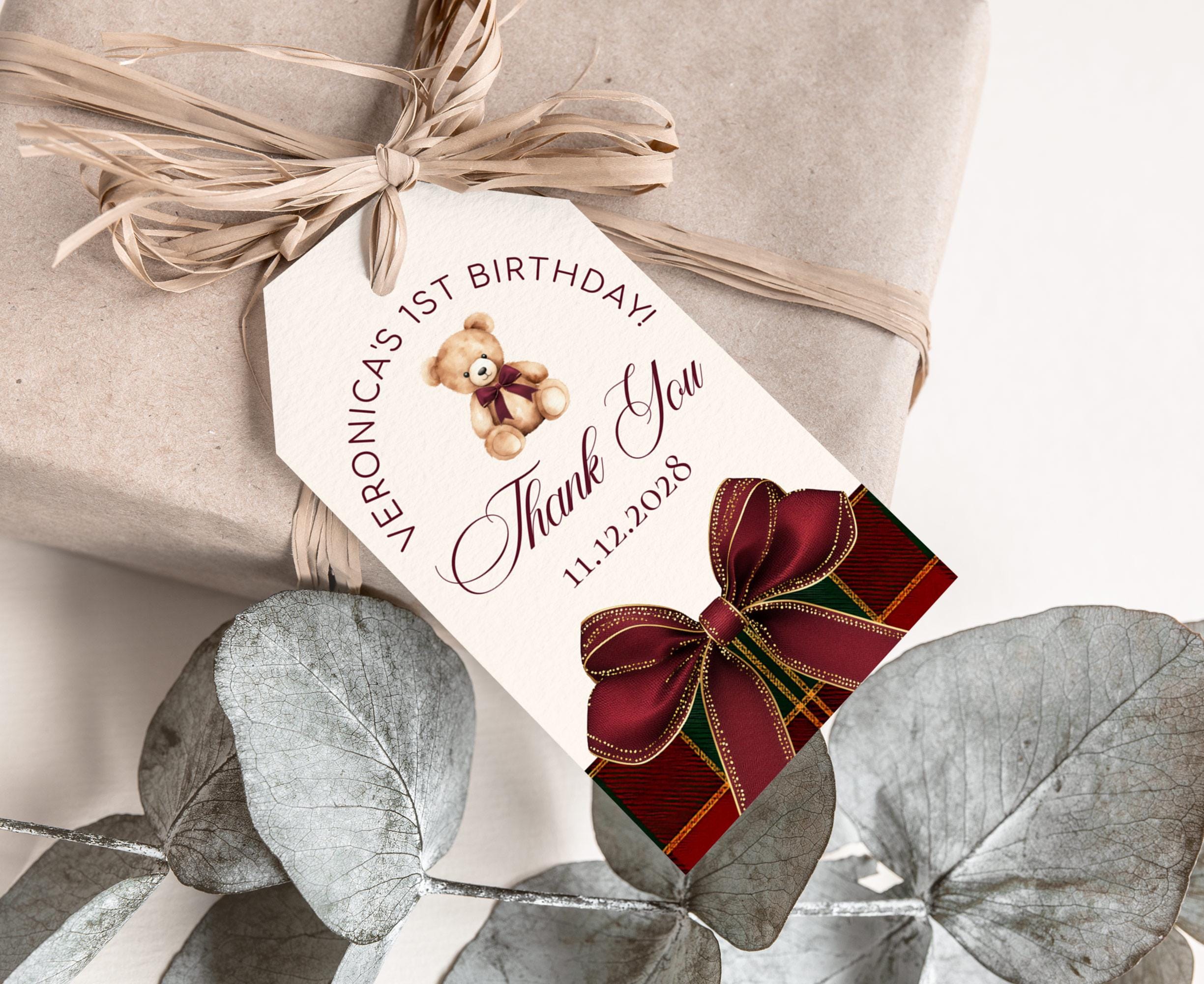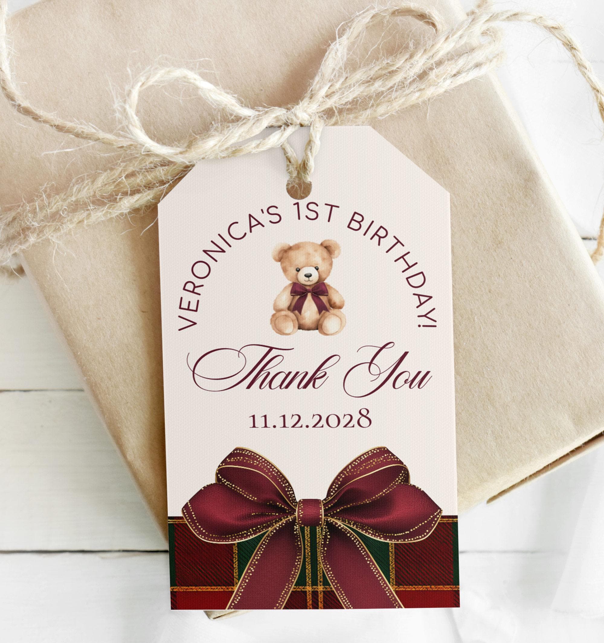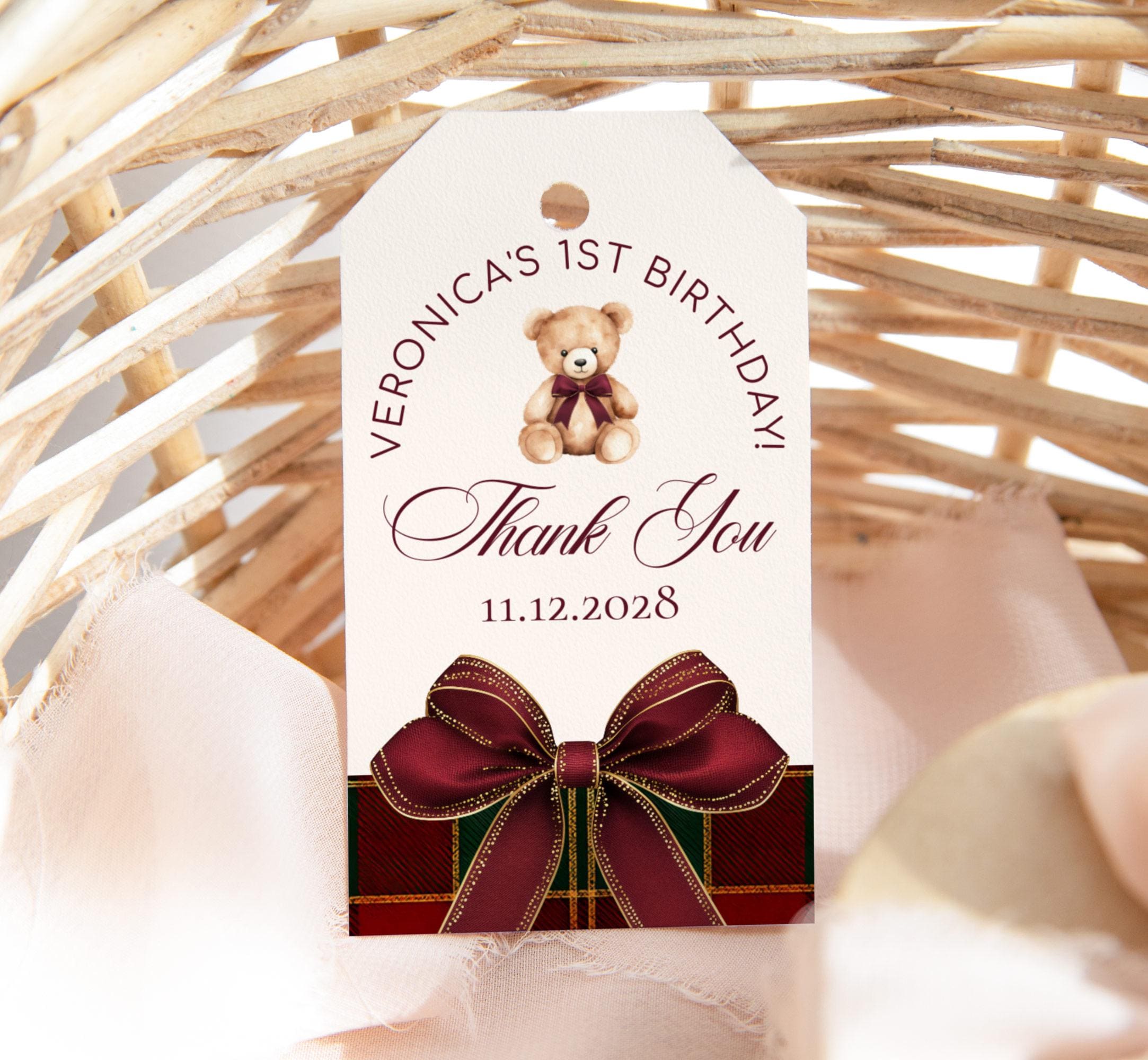 Winter classic Teddy Bear 1st Birthday Favor Tag: Elegant Red Bow Plaid Burgundy (Editable Corjl Template)
