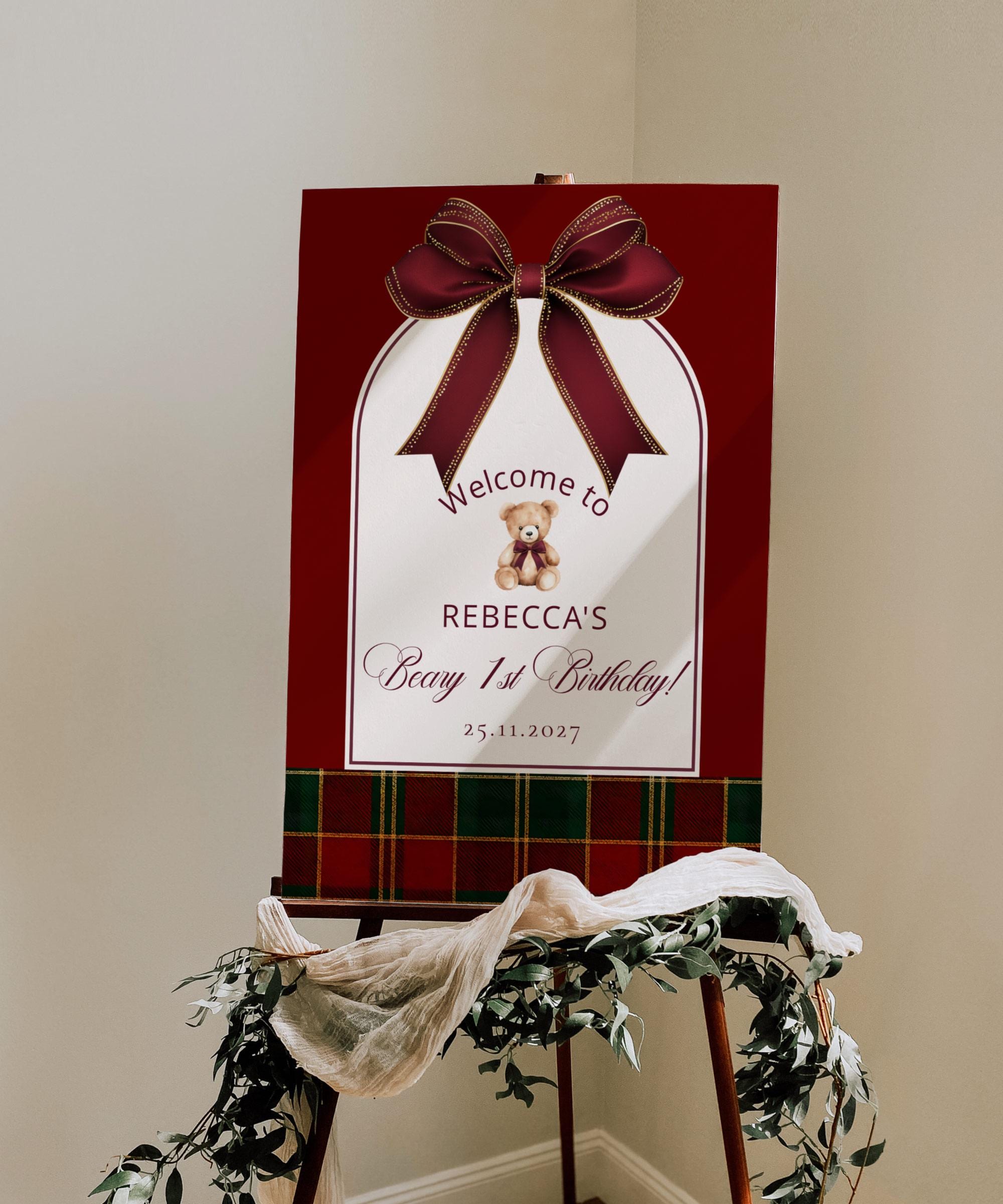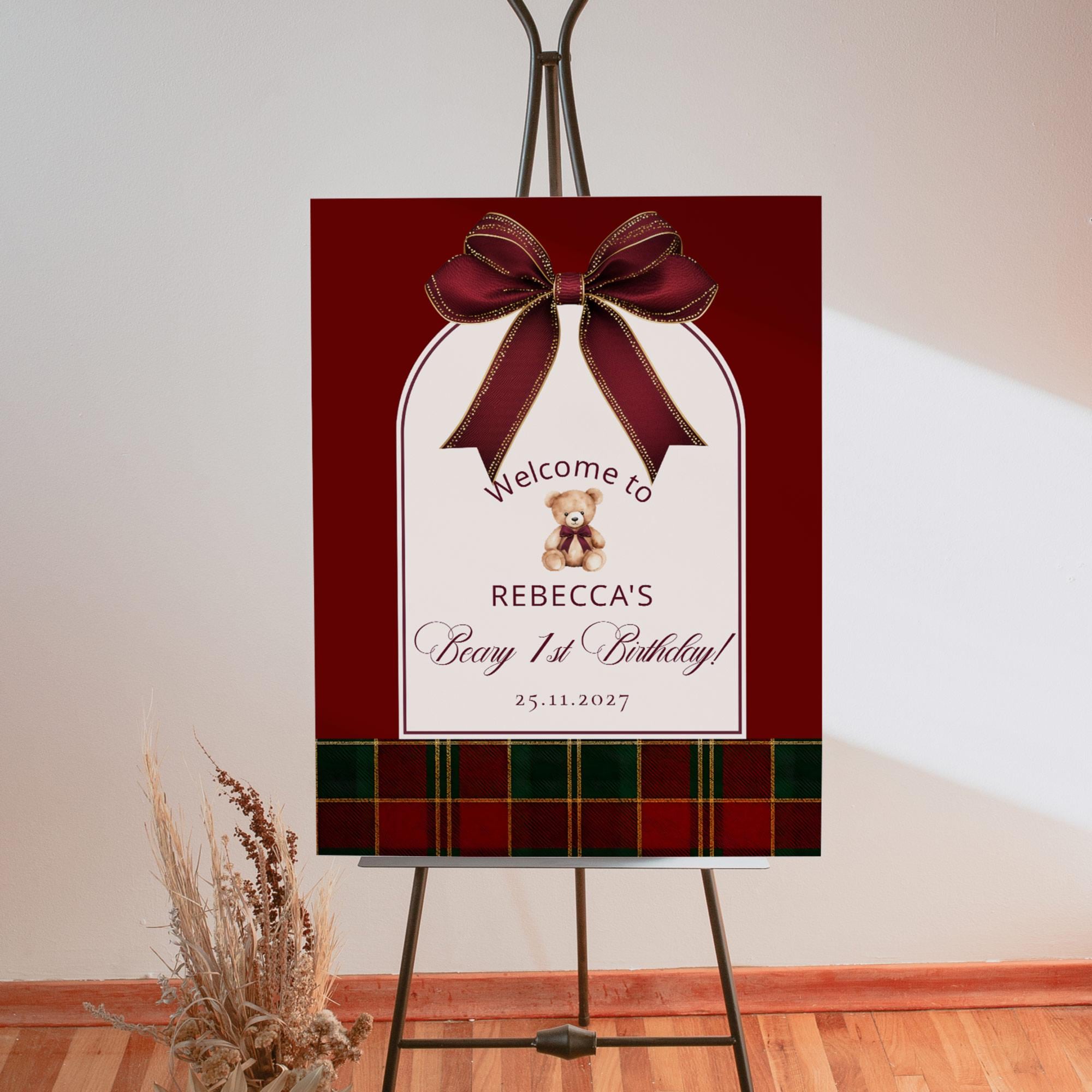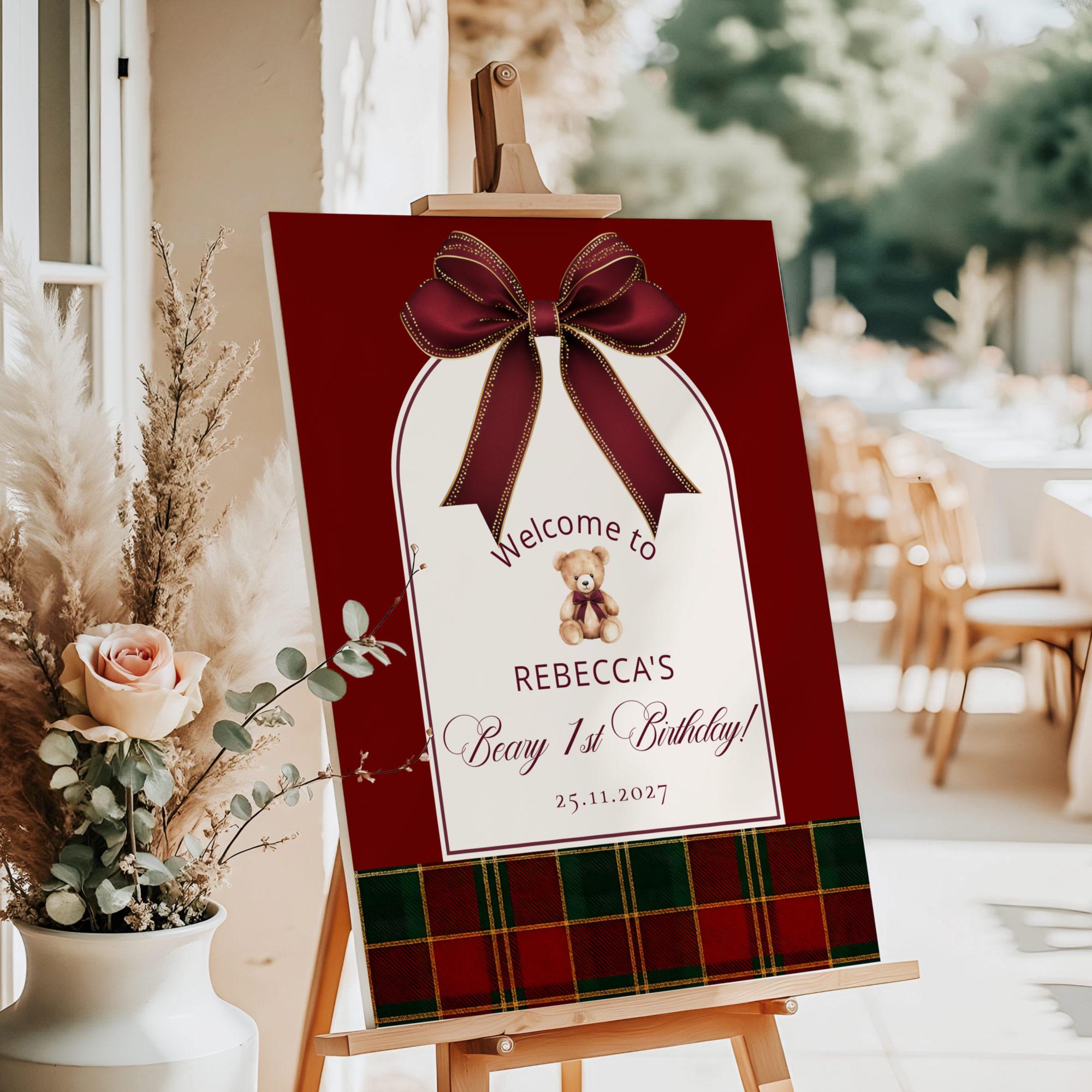 Christmas 1st Birthday Welcome sign template: Red Bow Teddy bear plaid Corjl