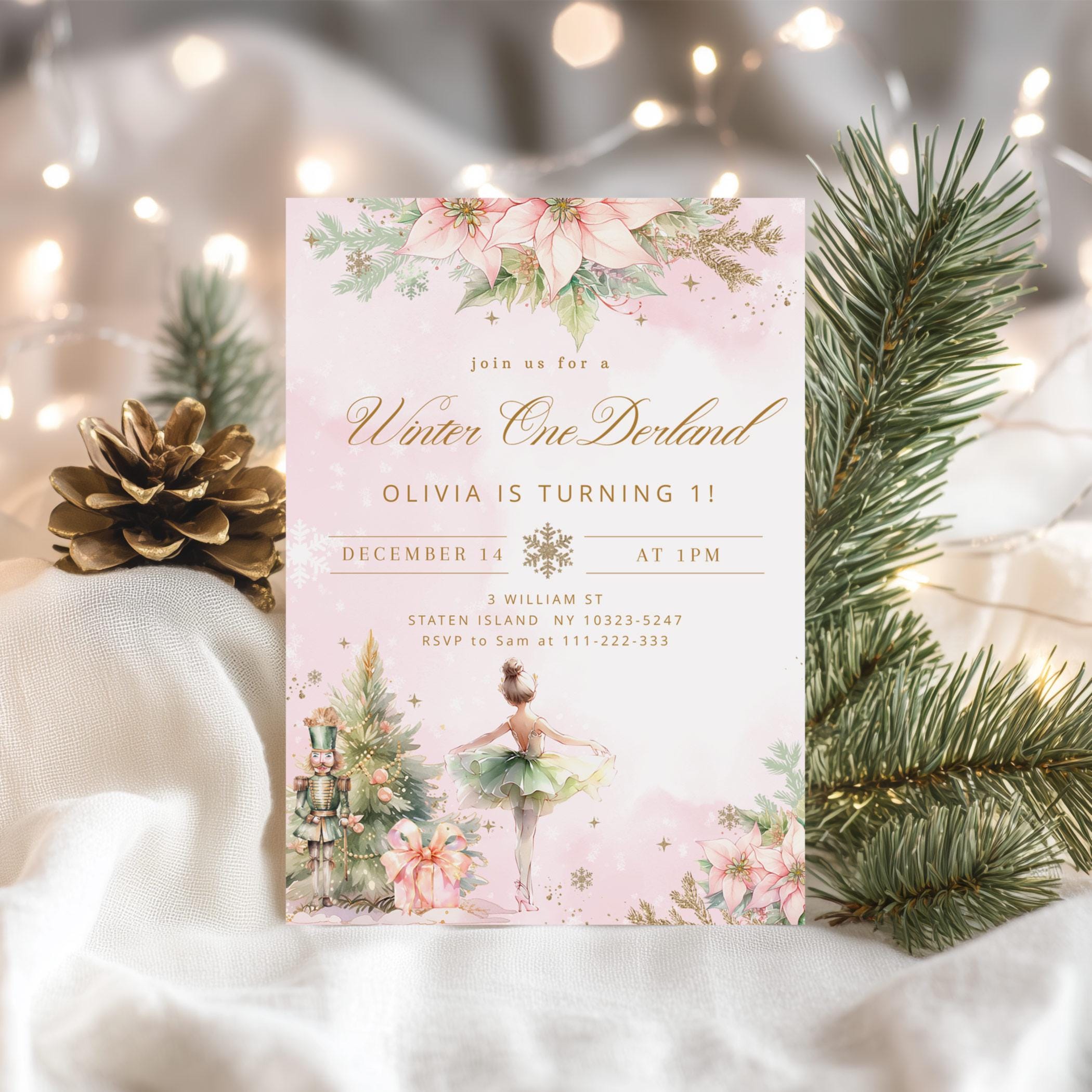 Winter Onederland 1st Birthday invitation, Nutcracker Pink Gold Editable Corjl Template
