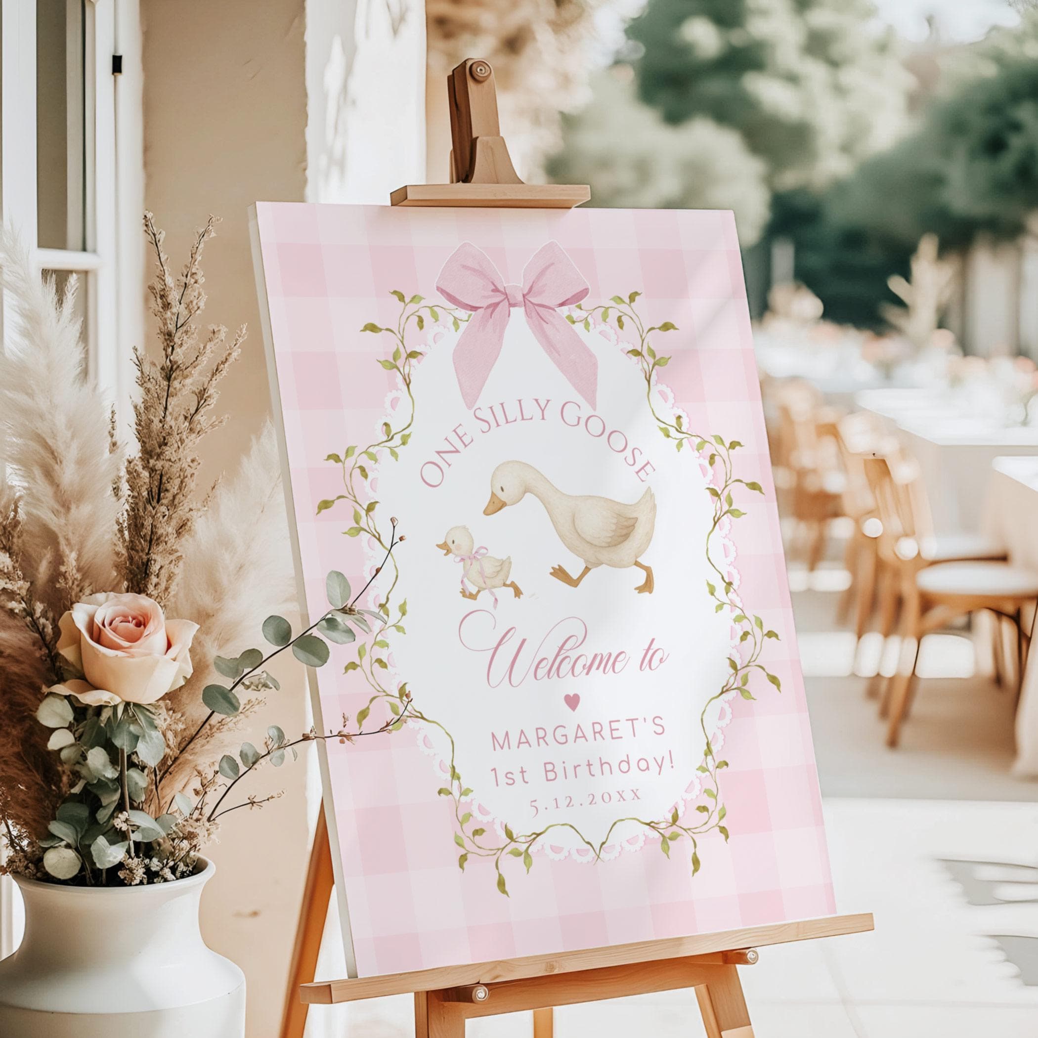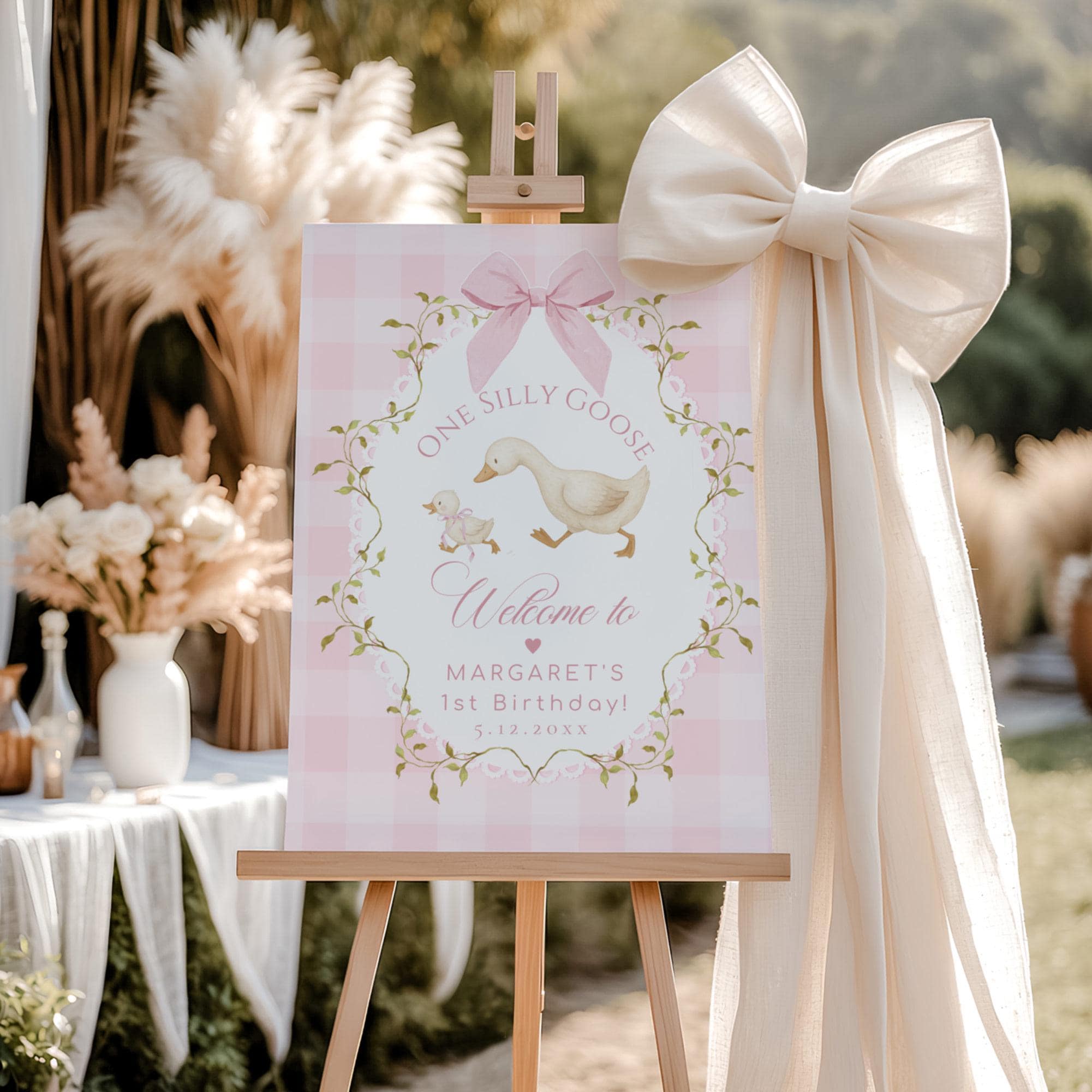 One Silly Goose 1st Birthday Welcome Sign Pink Bow Template (Corjl Editable)