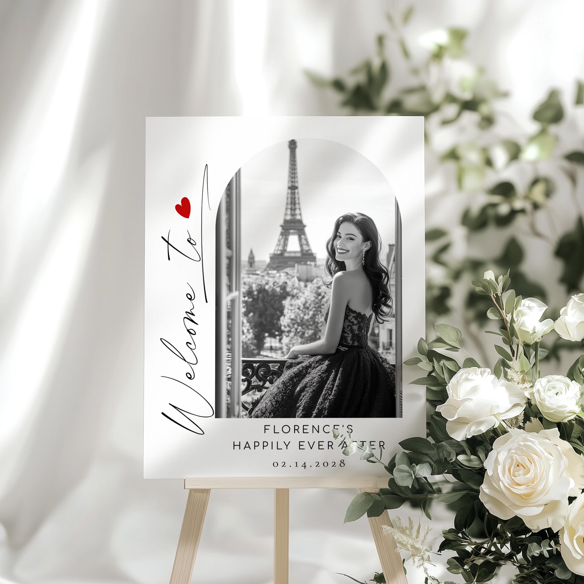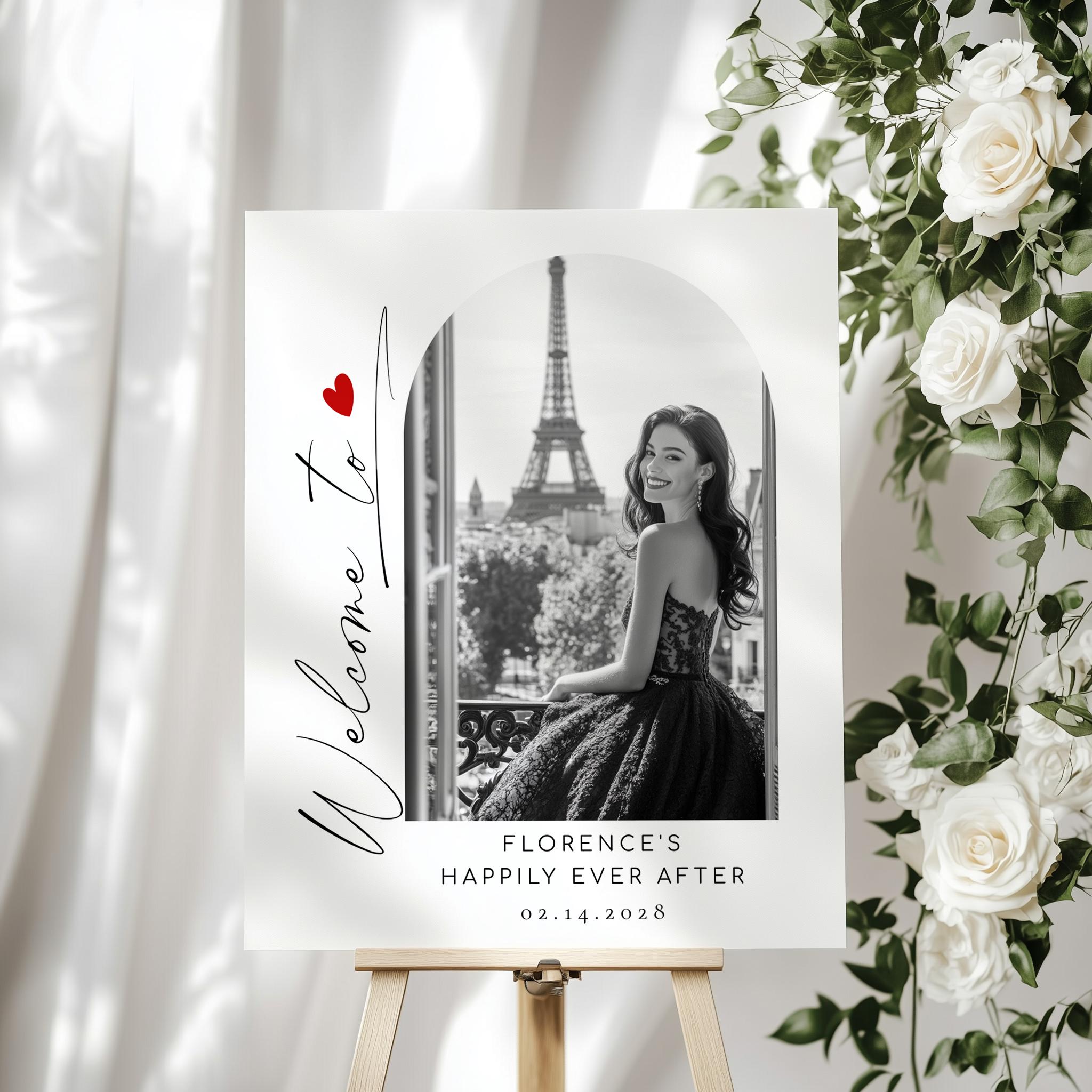 Black and white photo Happily Ever After Minimalist Welcome sign template