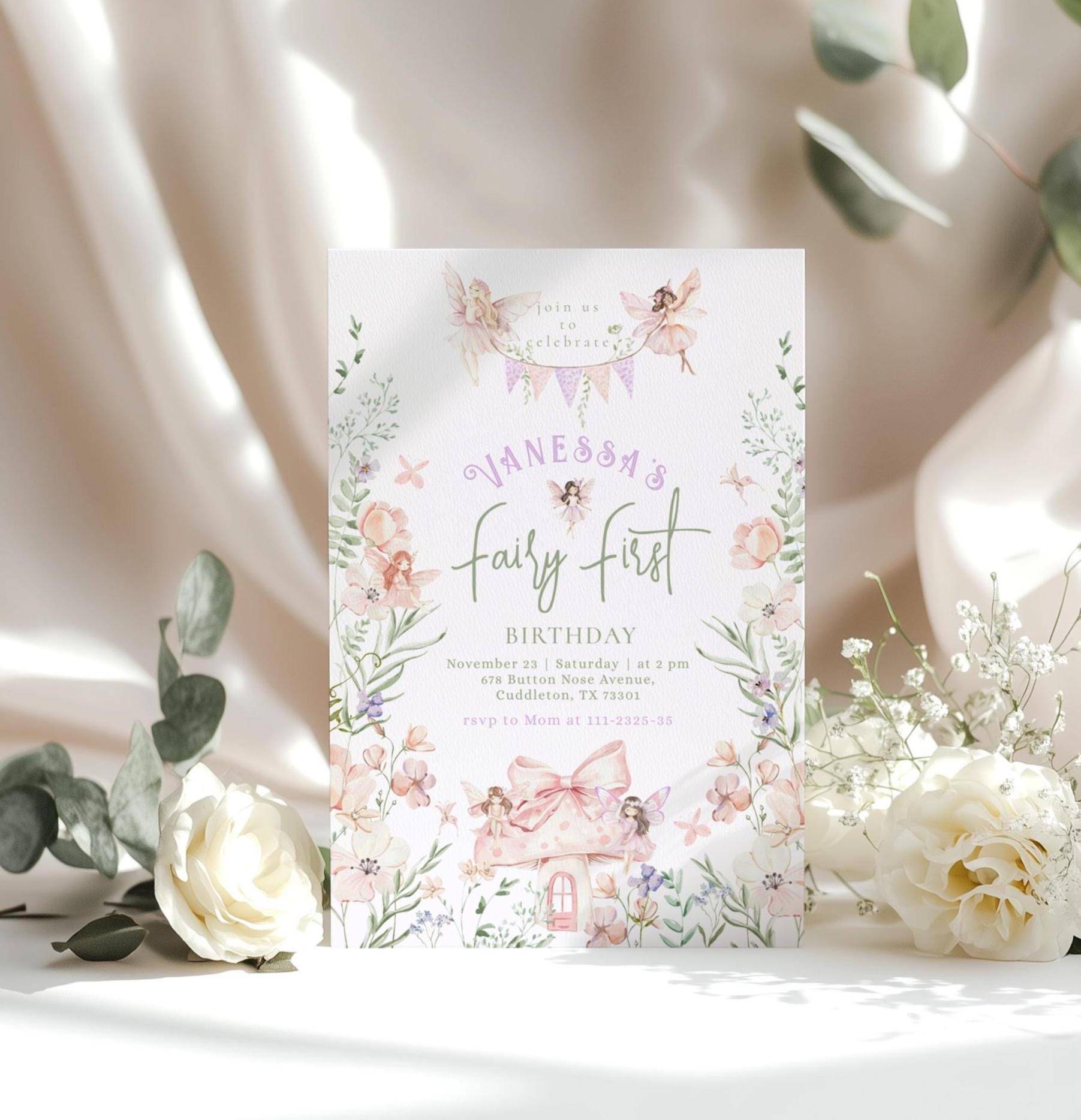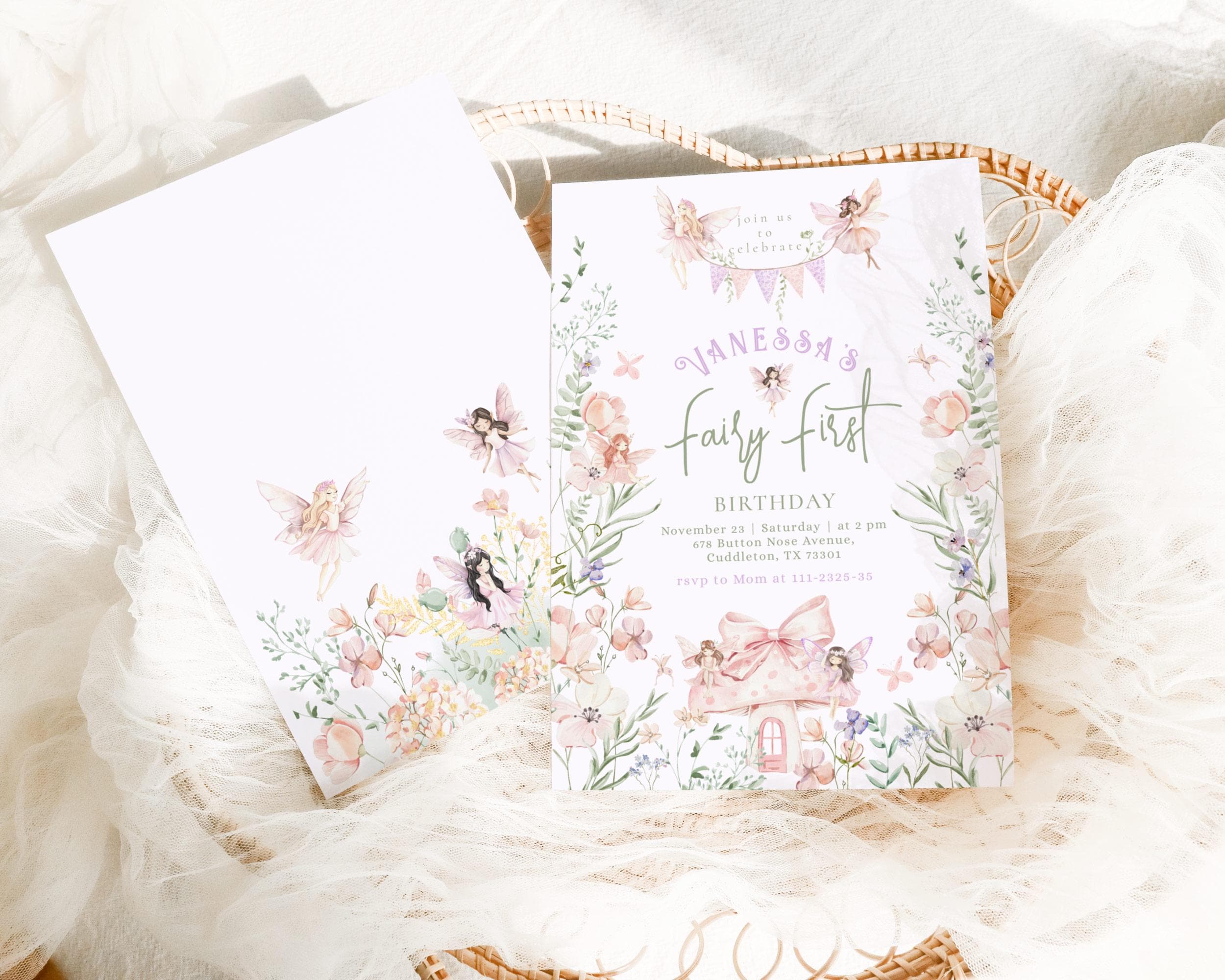 Fairy First Girl Birthday invitation template | Editable Enchanted Forest Girl 1st Birthday