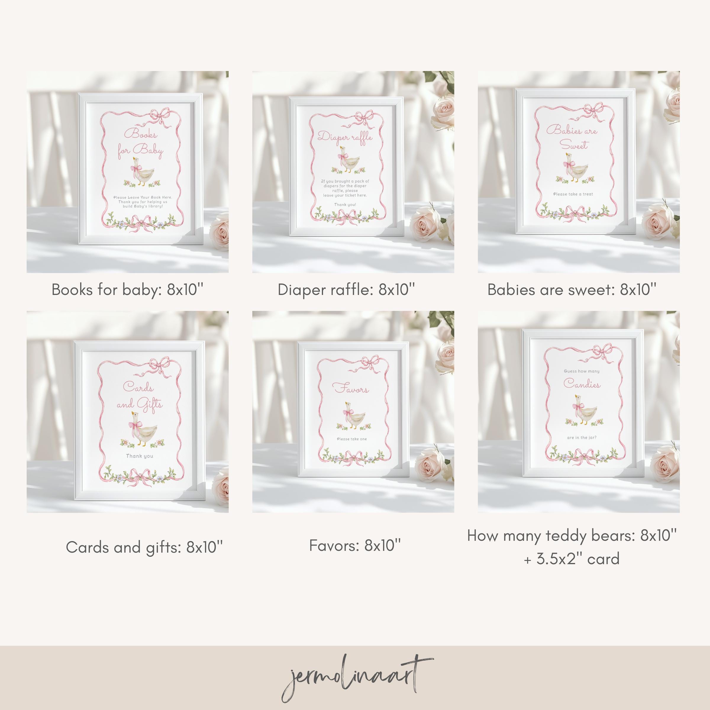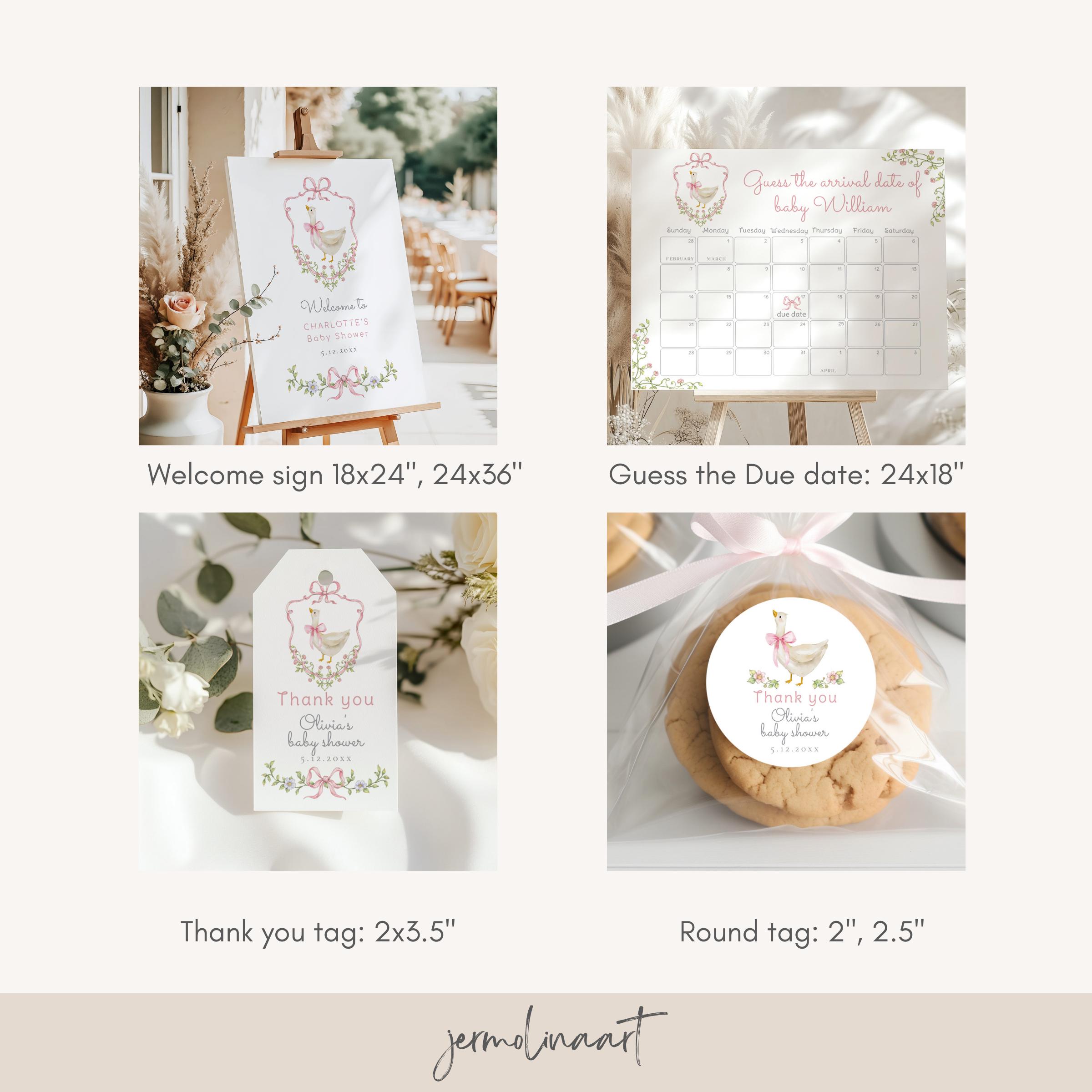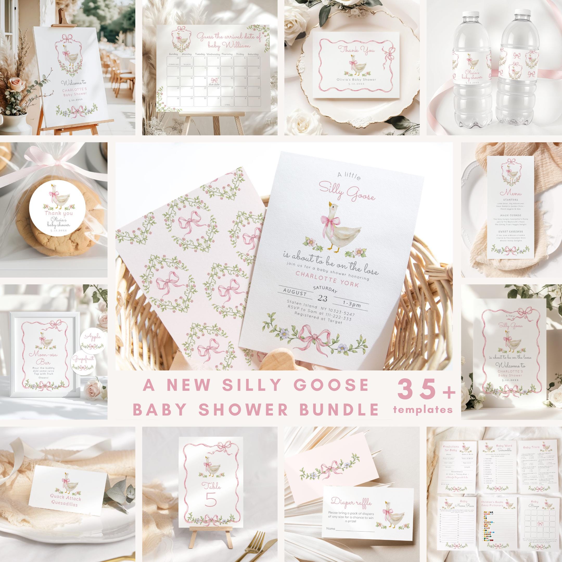 New Silly Goose Pink Bow Baby Shower bundle, Whimsical Floral Corjl Editable template