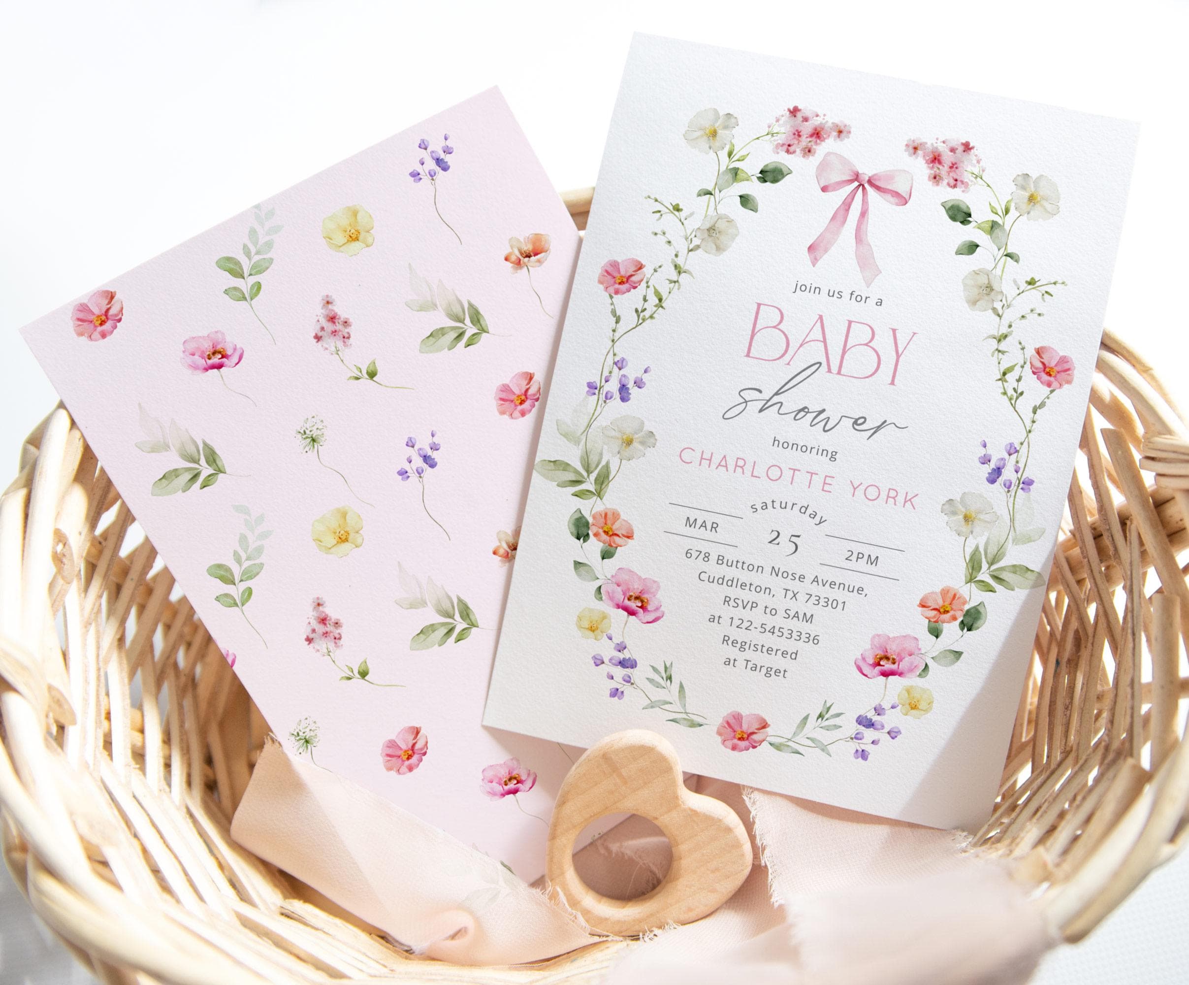 Wildflower Bow Baby Shower invitation | Spring floral wreath (Corjl Editable template)