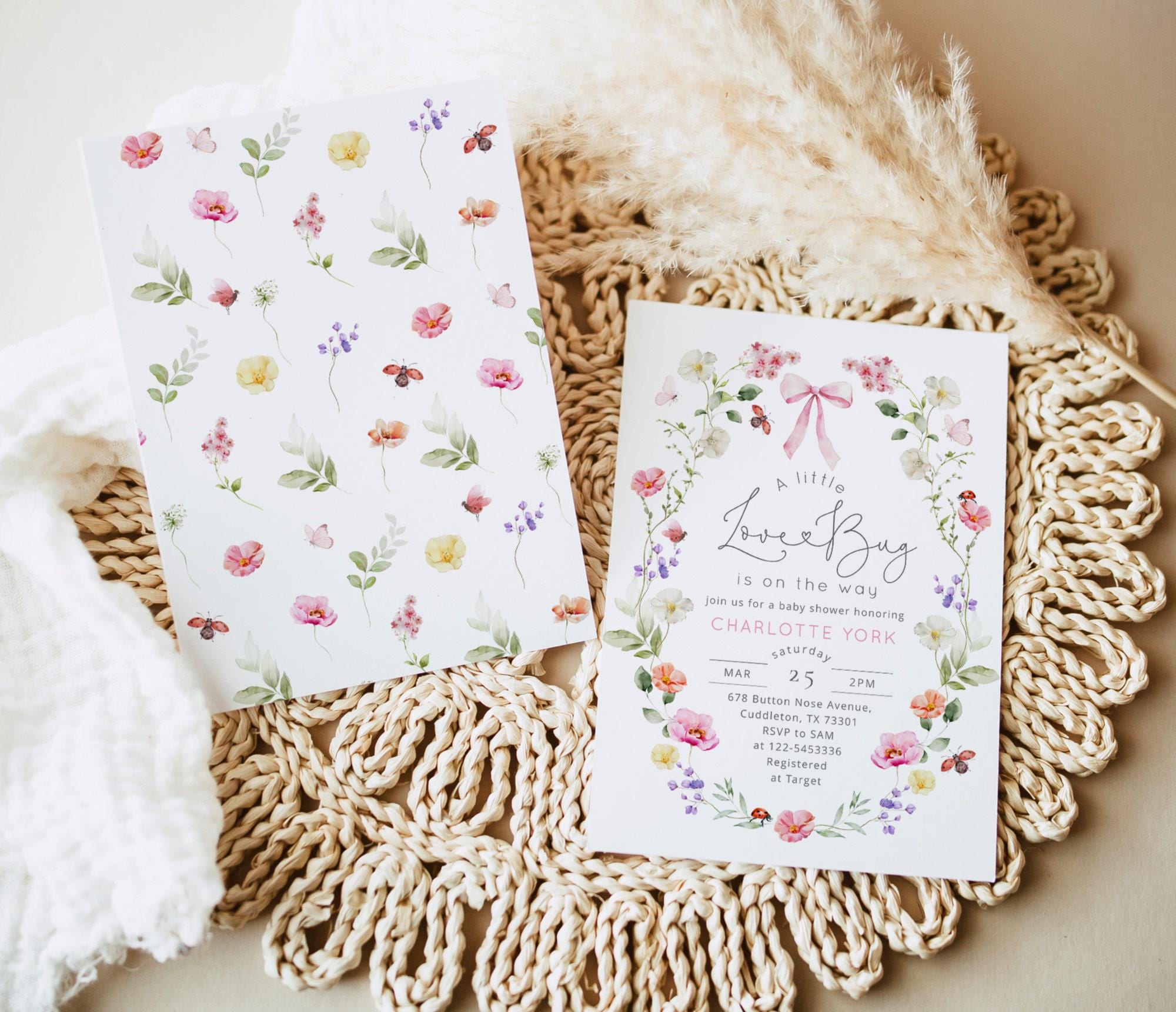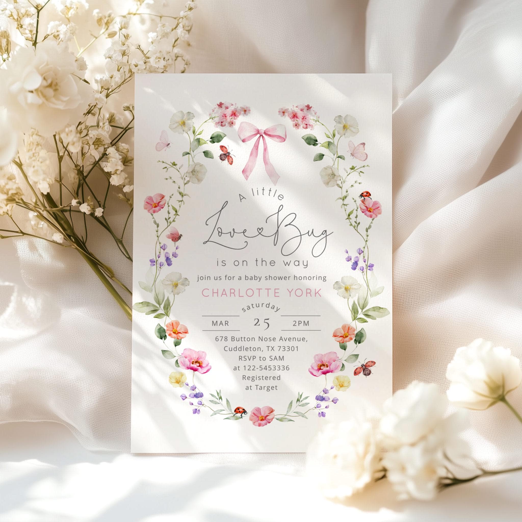 Little Love Bug Baby Shower invitation | Ladybird Wildflower Pink Bow Baby Shower Invitation