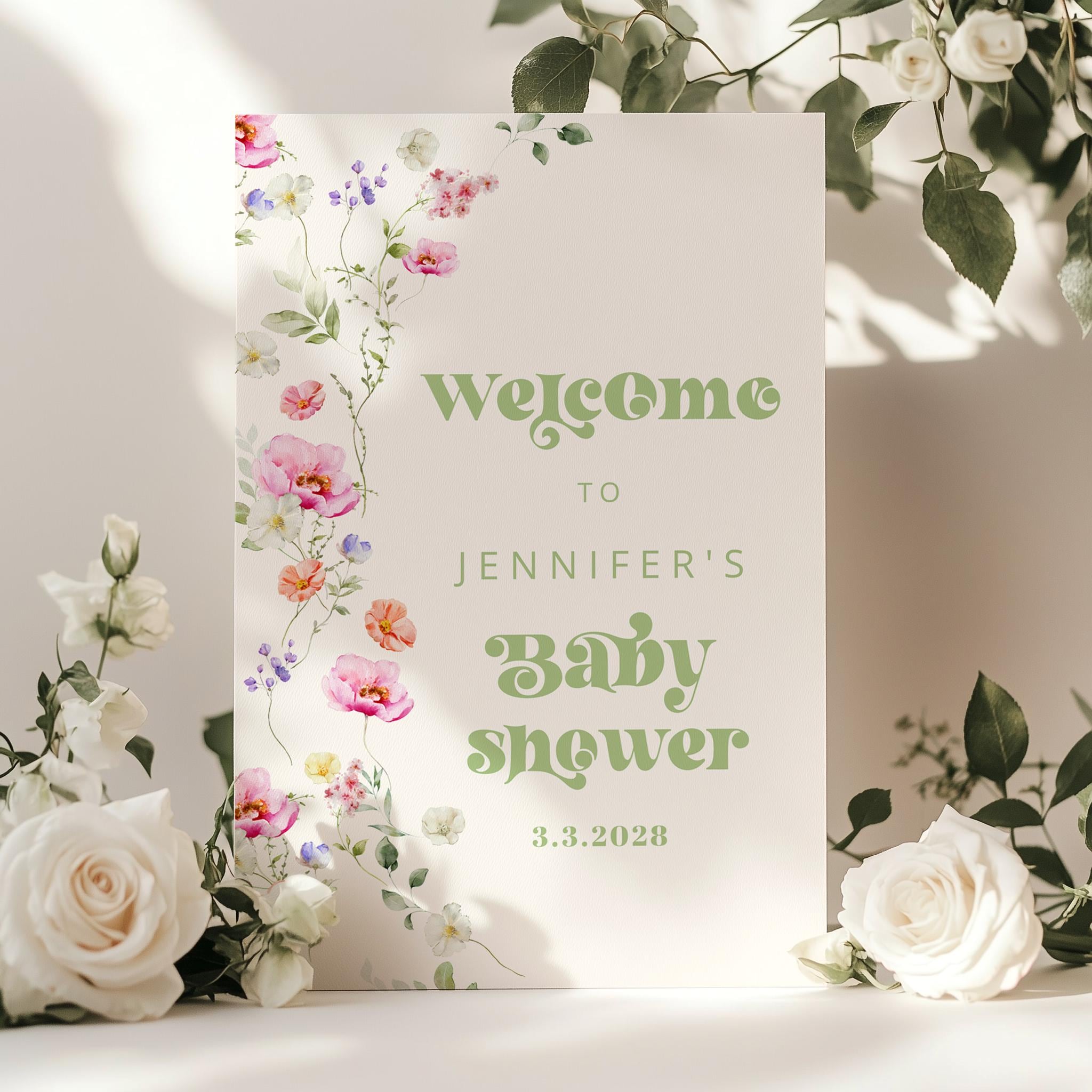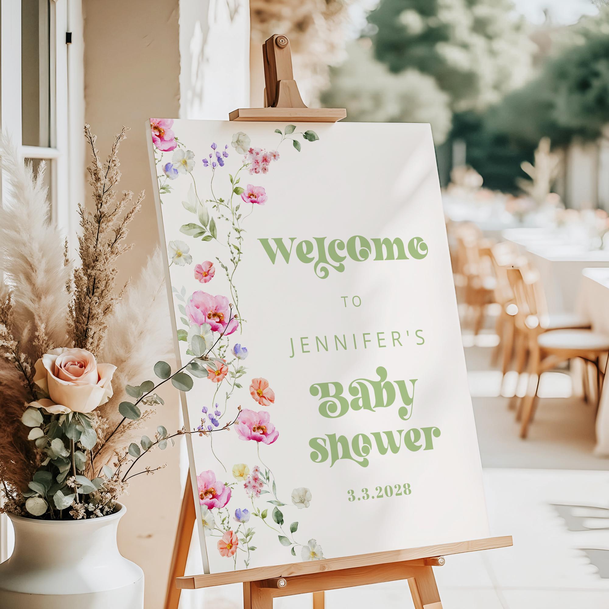 Wildflower Sage green Baby Shower Welcome sign template | Floral Editable Corjl