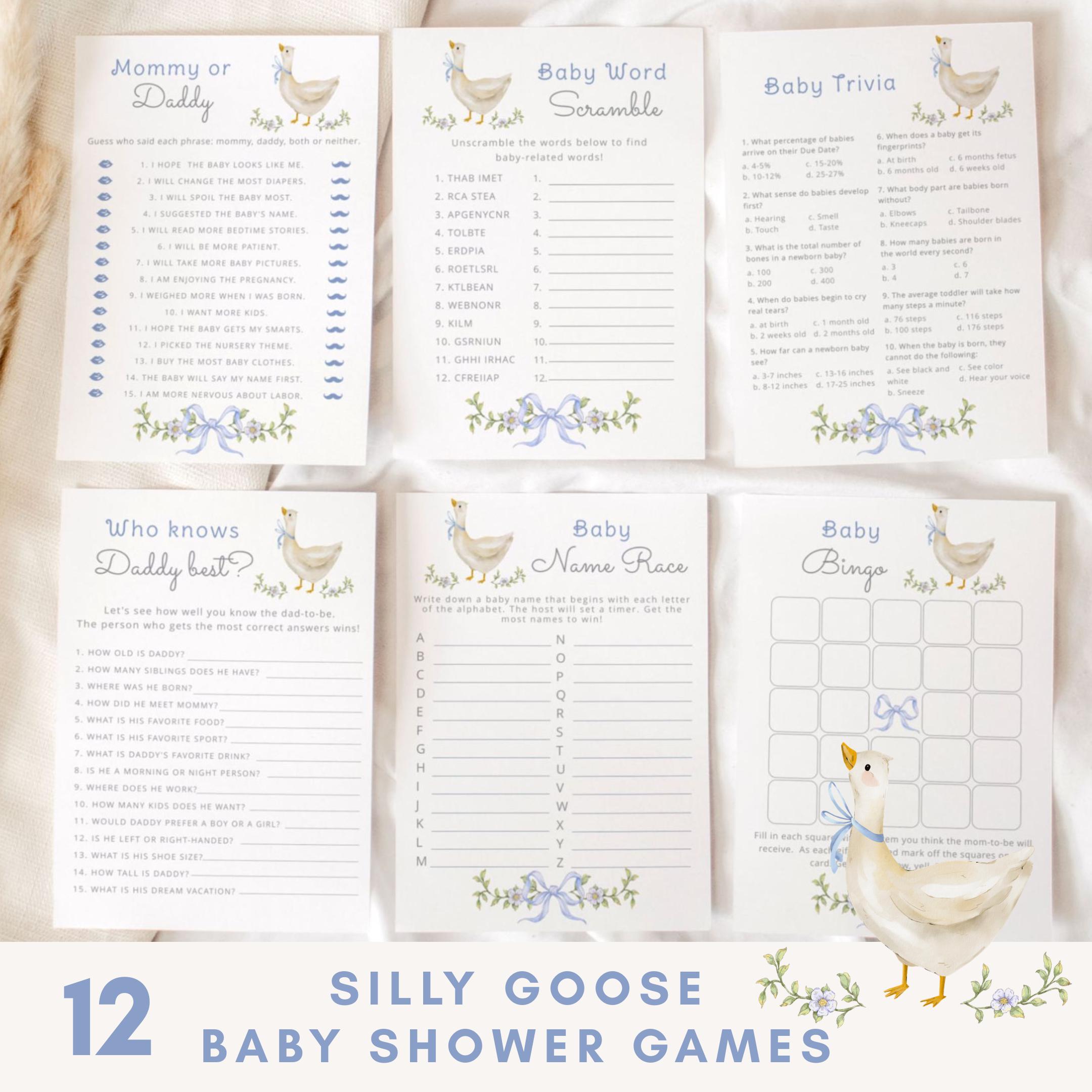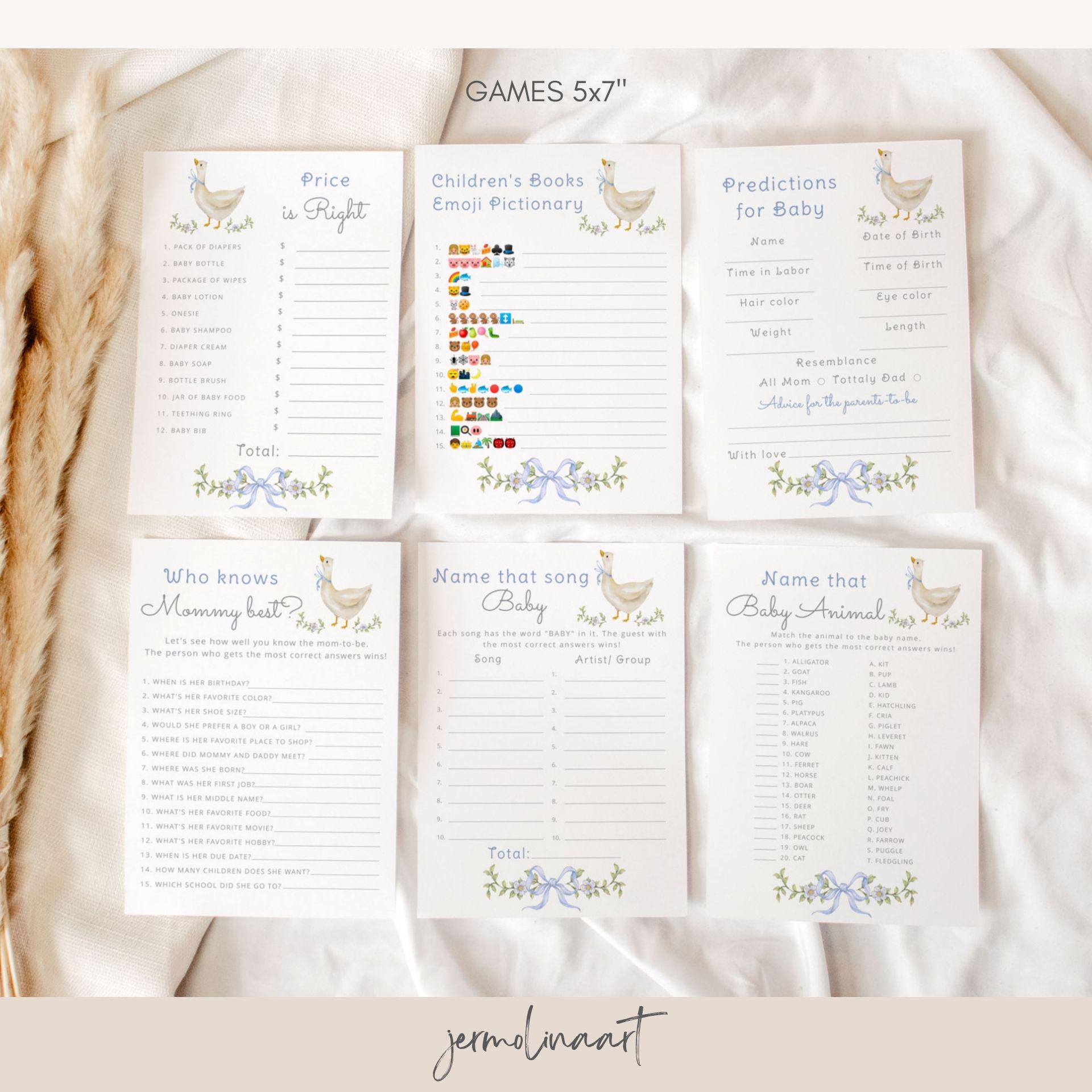 Silly Goose Blue Bow Baby Shower Games bundle, Whimsical Goose Editable Corjl templates